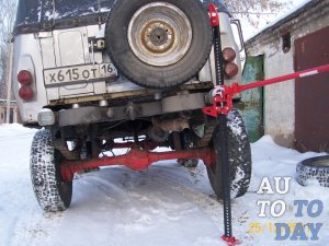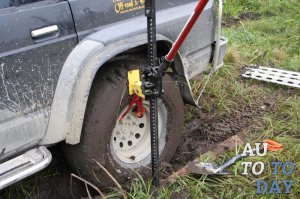 Реечный домкрат способен вытащить машину из любой грязи. Достаточно просто полить под башмак пластиковую подставку, и он не будет уходить в вязкий грунт. Если же такой подложки нет, то можно использовать любую доску, хоть это и отрицательно скажется на удобстве подъема. Отметим, что опытные джиперы привязывают пластиковую подложку к башмаку. Благодаря этому они не ищут подложку в грязи после окончания работы с хайджеком.