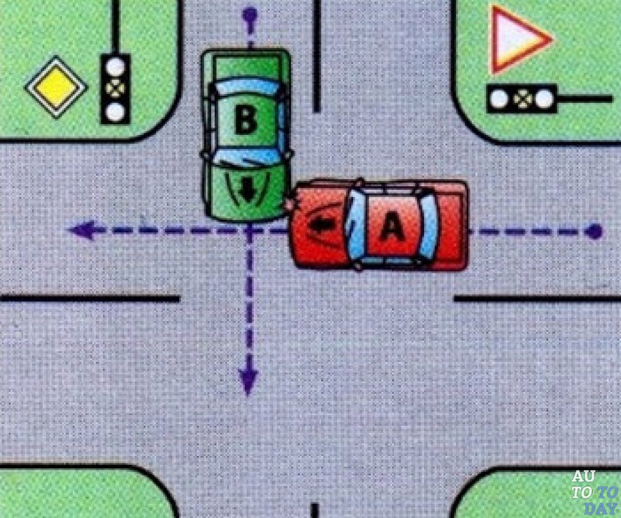 | При движении под углом | На регулируемом перекрёстке водитель машины А ехал на зелёный свет, в то время как водитель машины В проехал на красный, вследствие чего произошло столкновение |