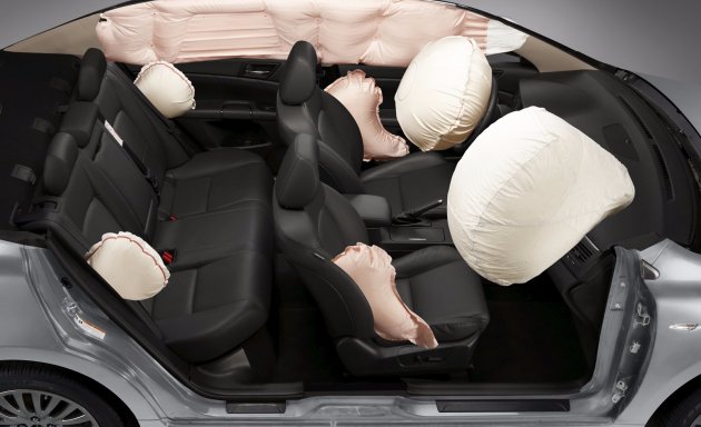 - Подушки безопасности — служат удерживающей системой и поглощают энергию инерции между пассажирами и внутренней конструкцией салона — рулём, приборной консолью, стойками, обшивкой кузова и лобовым стеклом, обеспечивая мягкую амортизацию при столкновении и минимизируя риск травм. Современные автомобили имеют различные конфигурации подушек: фронтальная, боковая, коленная, головные «шторки» (предназначена для защиты головы и шеи), подушка сидения (предназначена для защиты от погружения тазовой части ниже поясного ремня), подушки безопасности пешеходов.