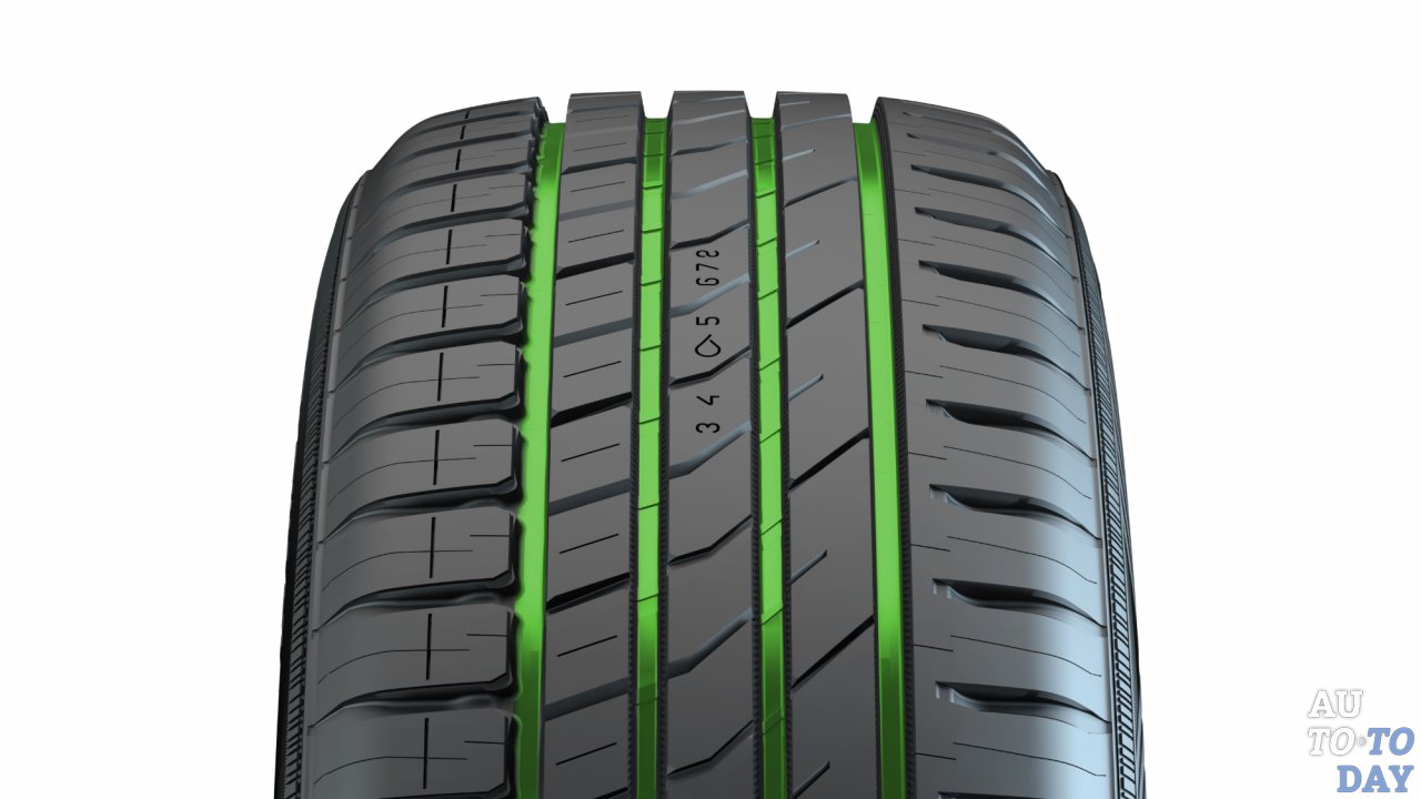 Чувствительность руля, подконтрольность машины в скоростных поворотах, минимальный тормозной путь – поддерживать все эти показатели на высоком уровне в случае с шиной Nokian Hakka Green 2 позволила прежде всего резиновая смесь Nokian Hakka Green Hybrid. Частицы силики, присутствующие в данном компаунде, организованы в виде сетки, которая с одной стороны достаточно плотная, а с другой стороны – настолько эластична, что протектор может легко адаптироваться к внешним условиям. Причем как на сухой, так и на мокрой дороге. Для понимания, насколько важен фактор правильно подобранной смеси: тормозной путь Hakka Green 2 на мокром асфальте со скорости 80 км/ч почти на 18 м короче, чем у обычных летних шин массового сегмента. За устойчивость на курсе и послушность рулю при резких маневрах отвечают массивные ребра, которые опоясывают шину по центру протектора.