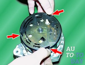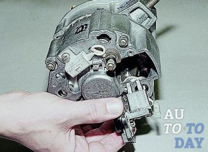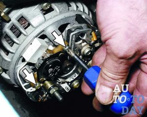 Перед заменой щеток, нужно сперва обесточить генератор. Чтобы это сделать, нужно отключить от батареи аккумулятора кабель «минуса», а потом снять регулятор напряжения. Сами щетки снимаются очень просто. Потом нужно штекер провода с вывода щеткодержателя. Далее понадобиться отвертка. Ею нужно будет отвернуть винт, на котором держится этот щеткодержатель. После того, как винт откручен, держатель можно вынимать. На место старого держателя нужно поместить новый. После замены эти операции нужно проделать в обратном порядке.
