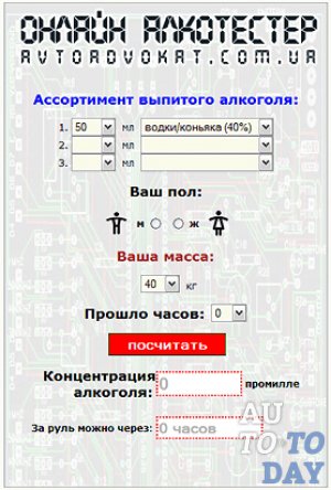 Принцип работы онлайн алкотестера основывается на определённом программном скрипте. От вас требуется ввод Ваших параметров и объём, наименование выпитого алкоголя.