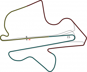 Длина главной цепи, обычно идущей по часовой стрелке, составляет 5,543 километра (3,474 мили), и она известна своими широкими углами и широкими прямыми. [ цитата необходима ] Расположение довольно необычное, с очень длинной спиной прямой (927 метров), отделенной от ямы прямо только одной очень тугой шпилькой .