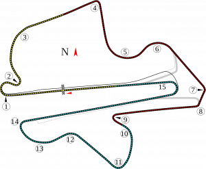 Длина главной цепи, обычно идущей по часовой стрелке, составляет 5,543 километра (3,474 мили), и она известна своими широкими углами и широкими прямыми. [ цитата необходима ] Расположение довольно необычное, с очень длинной спиной прямой (927 метров), отделенной от ямы прямо только одной очень тугой шпилькой .