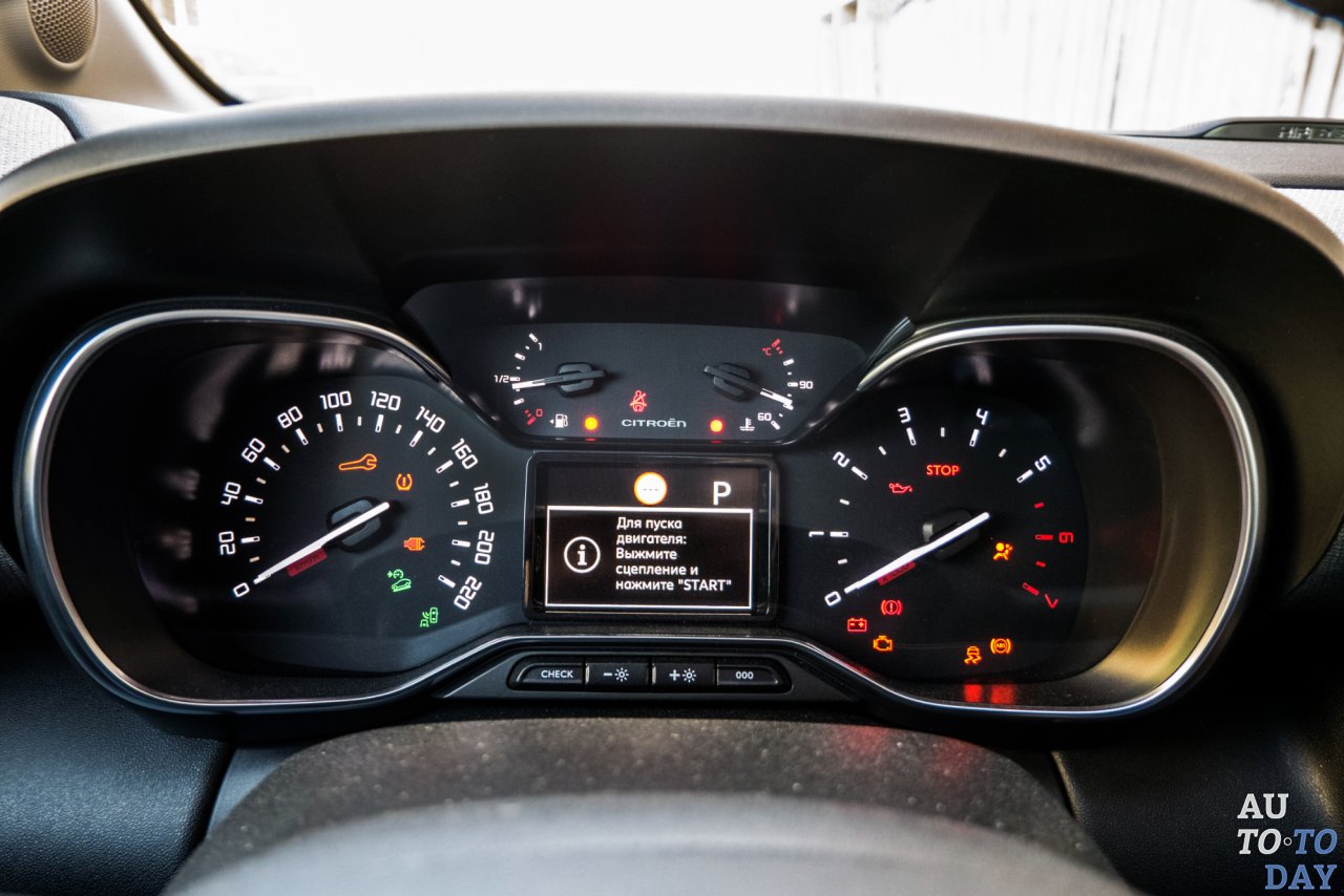 Щиток приборов, как и на других «Ситроенах», с которыми мы знакомились в последнее время, с квадратным шрифтом циферблатов и прямоугольным блоком климат-контроля. Разбивка на спидометре теперь более привычная для нас, «четная». Там, где мы привыкли видеть блок «климата», находится шайба управления функцией Grip Control и кнопка запуска двигателя. Руль, обшитый кожей, приятно-пухлый. Еще ниже расположилась полочка с беспроводной зарядкой для смартфона. Специальный индикатор загорается зеленым, когда стартует процесс зарядки. Непривычно видеть в компактном кроссовере и проекционный дисплей, который можно регулировать по яркости и высоте – новые опции в классе.