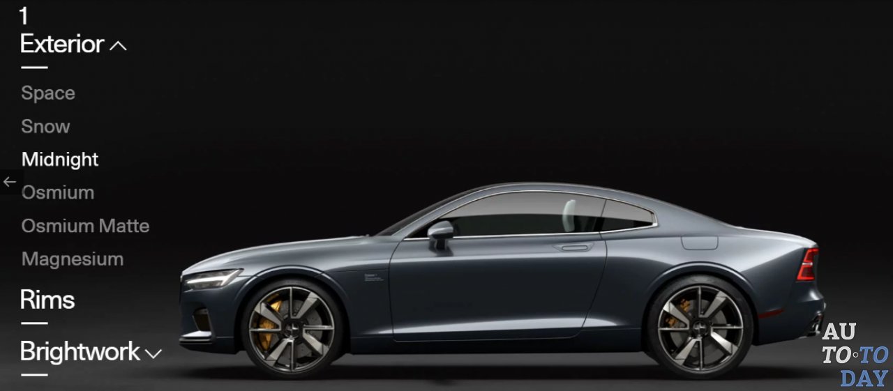 В отличие от конфигуратора Aston Martin DBS Superleggera, вариант для Polestar 1 прост в использовании и предлагает покупателю меньше возможностей, когда дело доходит до создания чего-то уникального. На выбор клиента предоставляется только шесть внешних отделок, а именно оттенки белого, черного и серебристого. Также доступен цвет Midnight (темный оттенок синего). Что касается колесных дисков, предлагается единый дизайн в отделке Diamond Cut, Glossy Black и Matte Black.