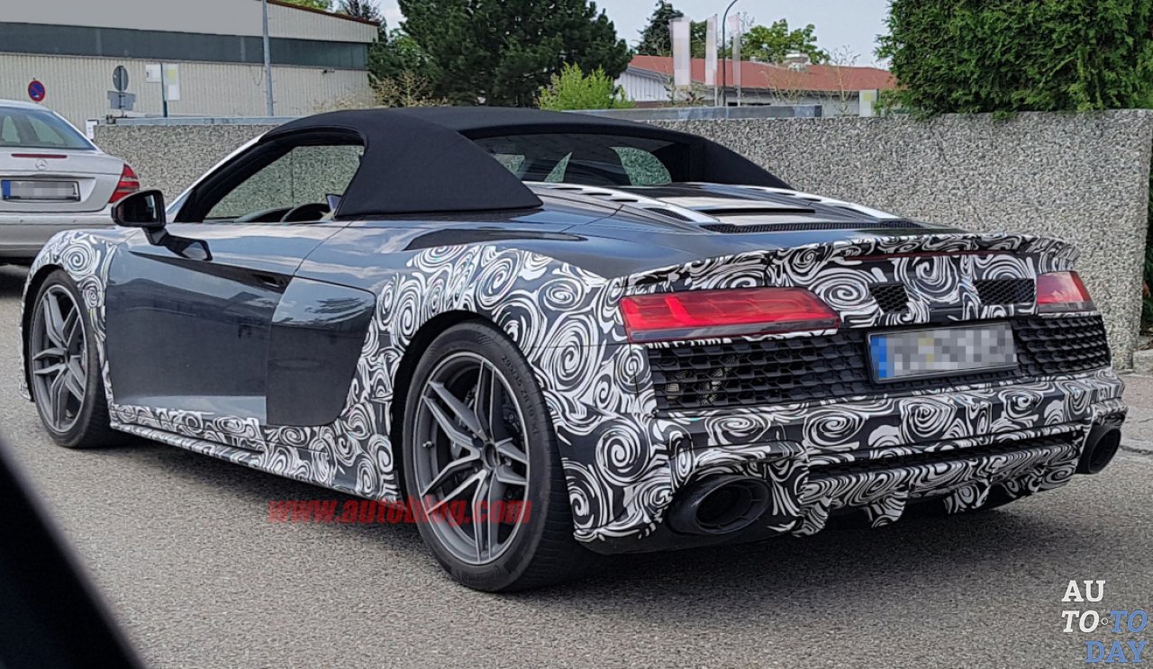 В настоящий момент немецкий производитель тестирует кабриолет Audi R8 Spyder, имеющий несколько визуальных моментов от обновленного купе. В общем на снимках просматриваются самые масштабные изменения (по сравнению с нынешней моделью), сосредоточенные на решетке радиатора. Боковая часть остается практически идентичной предшественнику, в то время как задняя – получает кардиальные перемены. Теперь под задними фарами располагается широкая решетка, разделенная номерным знаком, массивный спойлер и овальные выхлопные трубы, пришедшие на замену прямоугольным (в стиле RS). Фактически это все аналогично обновлениям купе.
