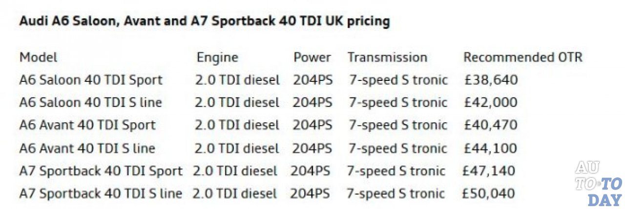 Модели, включая A6 Saloon, A6 Avant и A7 Sportback можно будет заказать с новым 2,0-литровым дизельным двигателем TDI. Доступный в спецификации Sport и S Line, агрегат обеспечивает 204 лошадиных сил и сочетается с семиступенчатой автоматической коробкой передач S tronic. Благодаря такому оснащению четырехдверный Audi A6 может с места разгоняться до 100 км/ч за 8,1 секунды, в то время как A6 Avant и A7 Sportback требуется дополнительные 0,2 секунды. Максимальная скорость составляет 240 км/ч для A6 Avant и 245 км/ч для A6 Saloon и A7 Sportback.