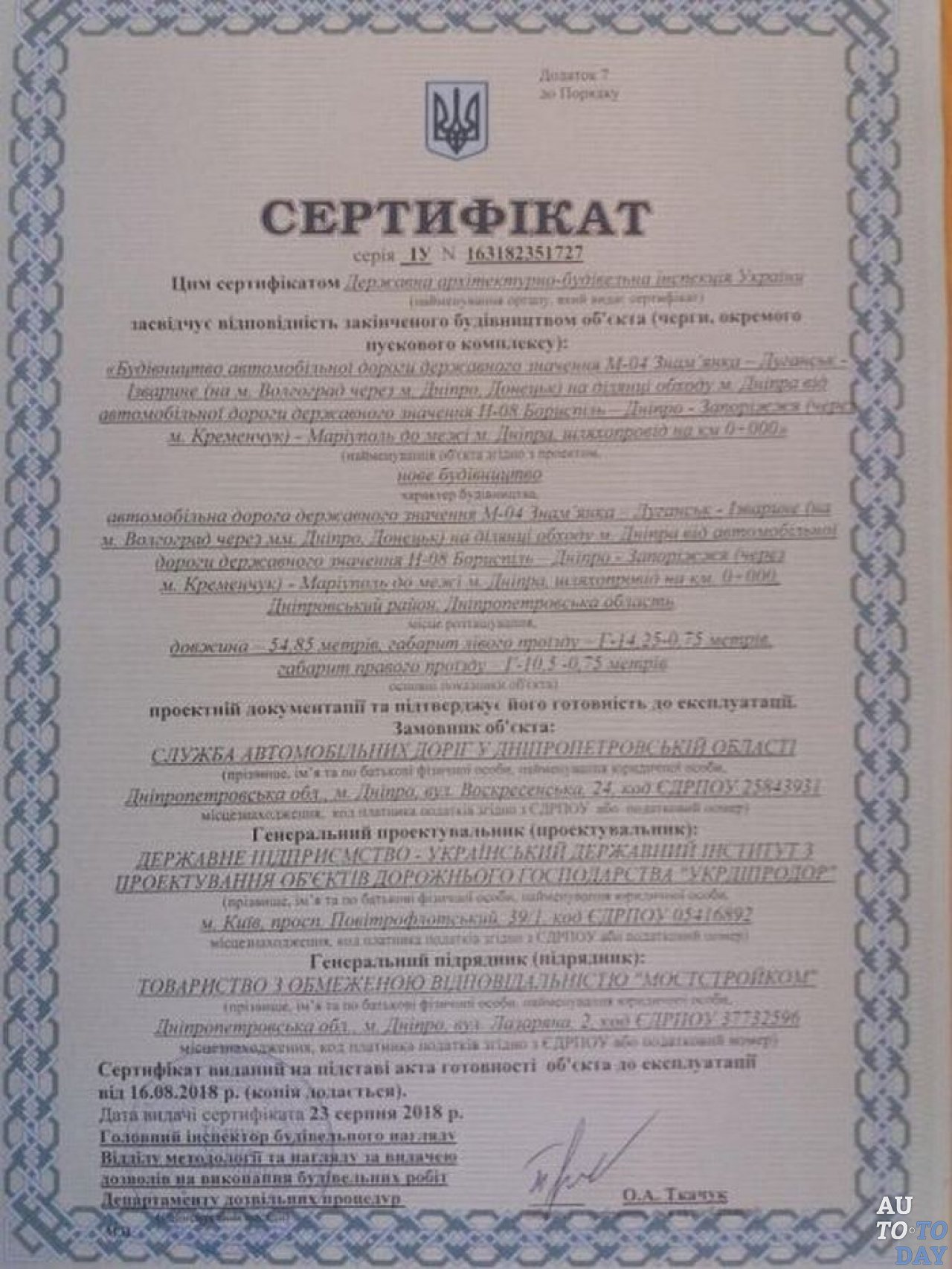 «Сертификат на ввод в эксплуатацию моста на Объездной Днепра. Официально. Мы избавили Днепр от многолетней петли. Подтверждено официальным документом», - написал чиновник и подтвердил свои слова, прикрепив к сообщению фотографию соответствующего документа. По словам Голика, следующим запланированным этапом проведения работ будет оформление документов по участку трассы Аэропортовская-Южный мост и ремонт дороги до Южного моста.