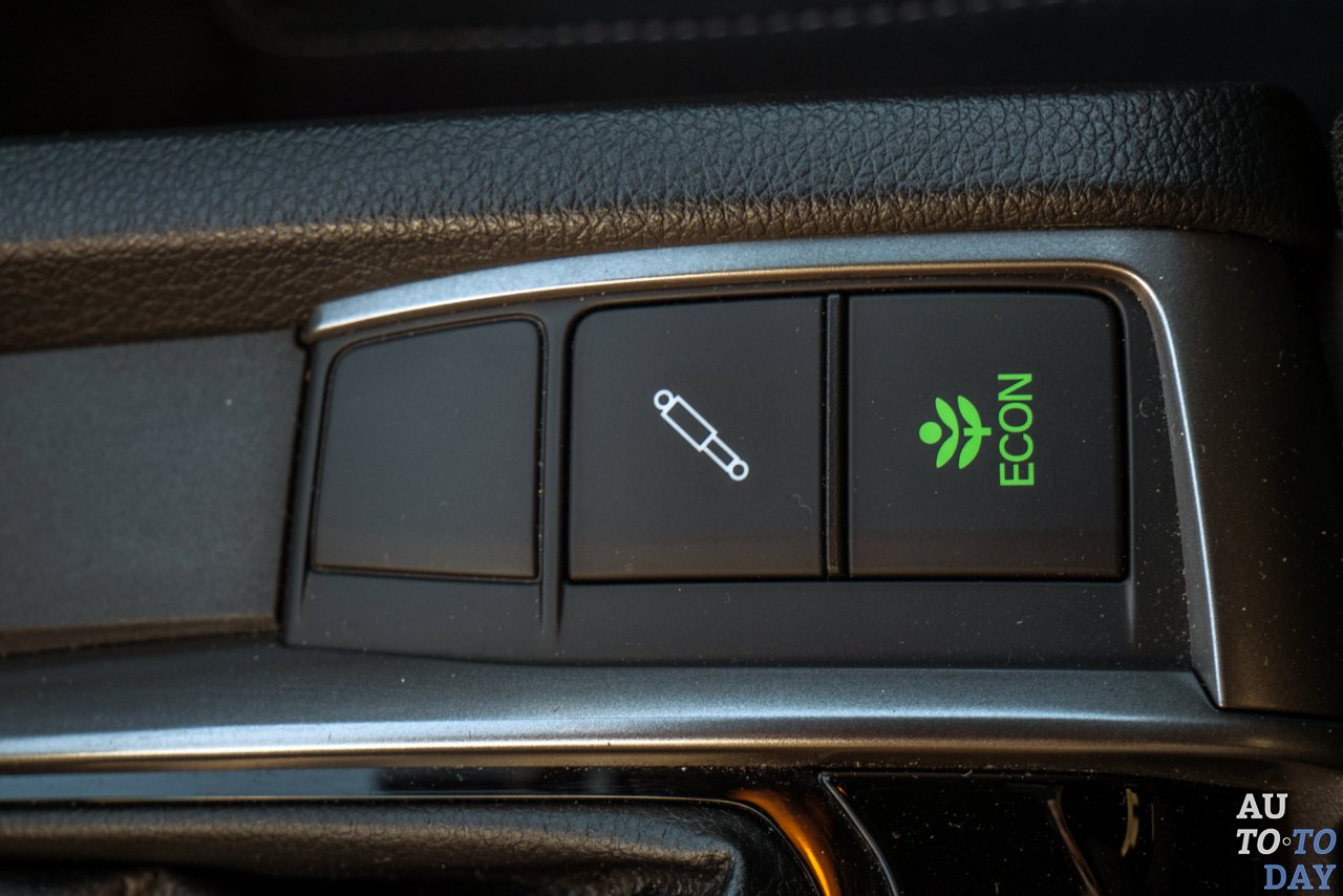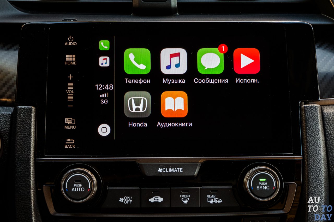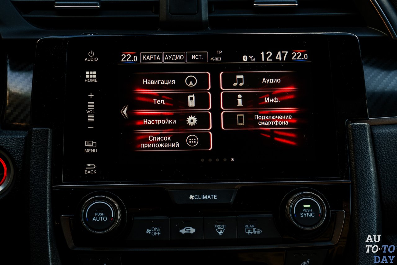 На центральной консоли прописался 7-дюймовый сенсорный дисплей с мультимедиа на Android. Поддержка Android Auto и Apple CarPlay для «Хонд» уже вошла в привычку. Кроме хорошей отзывчивости, мультимедиа еще стоит похвалить за классную навигацию от Garmin. Пусть она еще не выучила новые названия улиц, но всегда предлагает несколько маршрутов (в зависимости от заданных приоритетов), и знает даже самые хитрые улочки в провинциальных городках. При нажатии на клавишу «Климат» на экран выводится информация о направлении воздуха и температуры. Но сами градусы выставляются двумя отдельными ручками.
