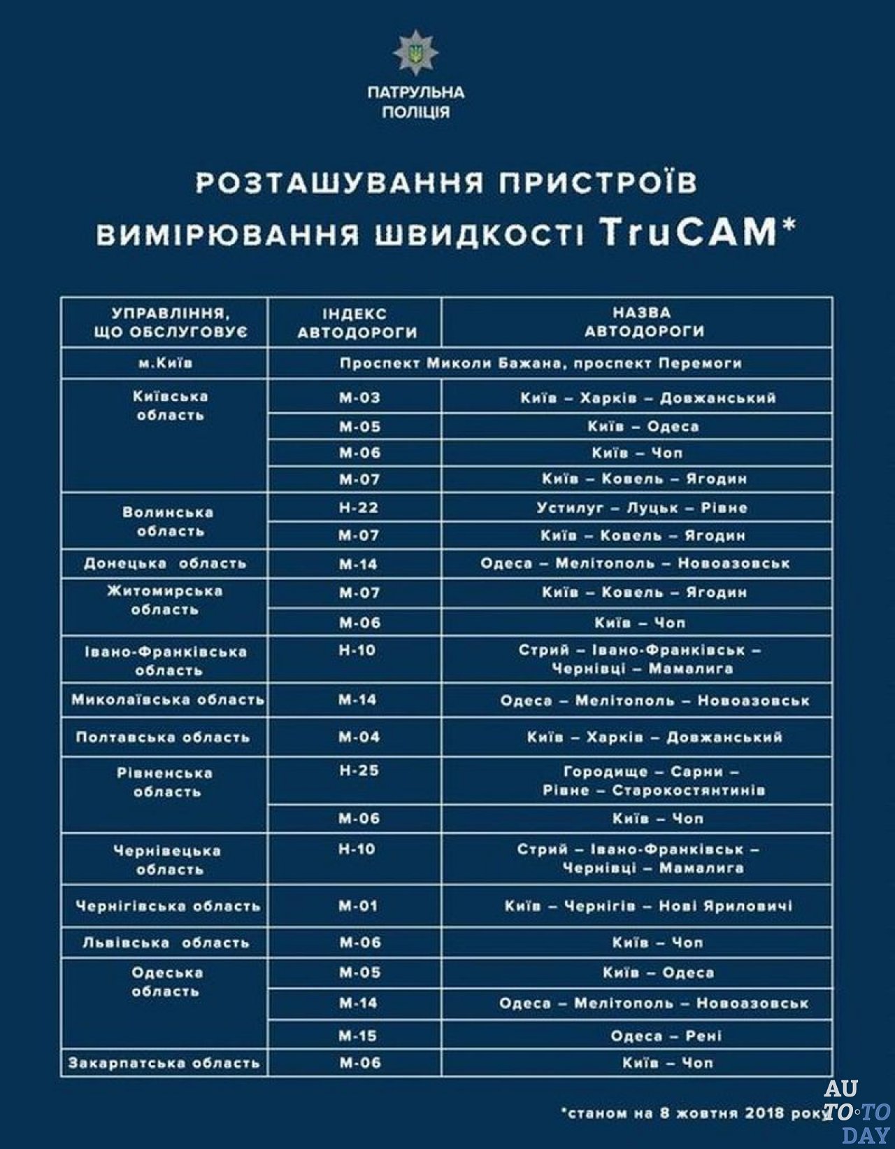 Патрульная полиция Украины на своем официальном сайте опубликовала полный список дорог, на которых будет осуществляться контроль скорости посредством лазерных радаров. Начиная с 8 октября, радарами TruCam будут укомплектованы работающие на этих участках патрули.