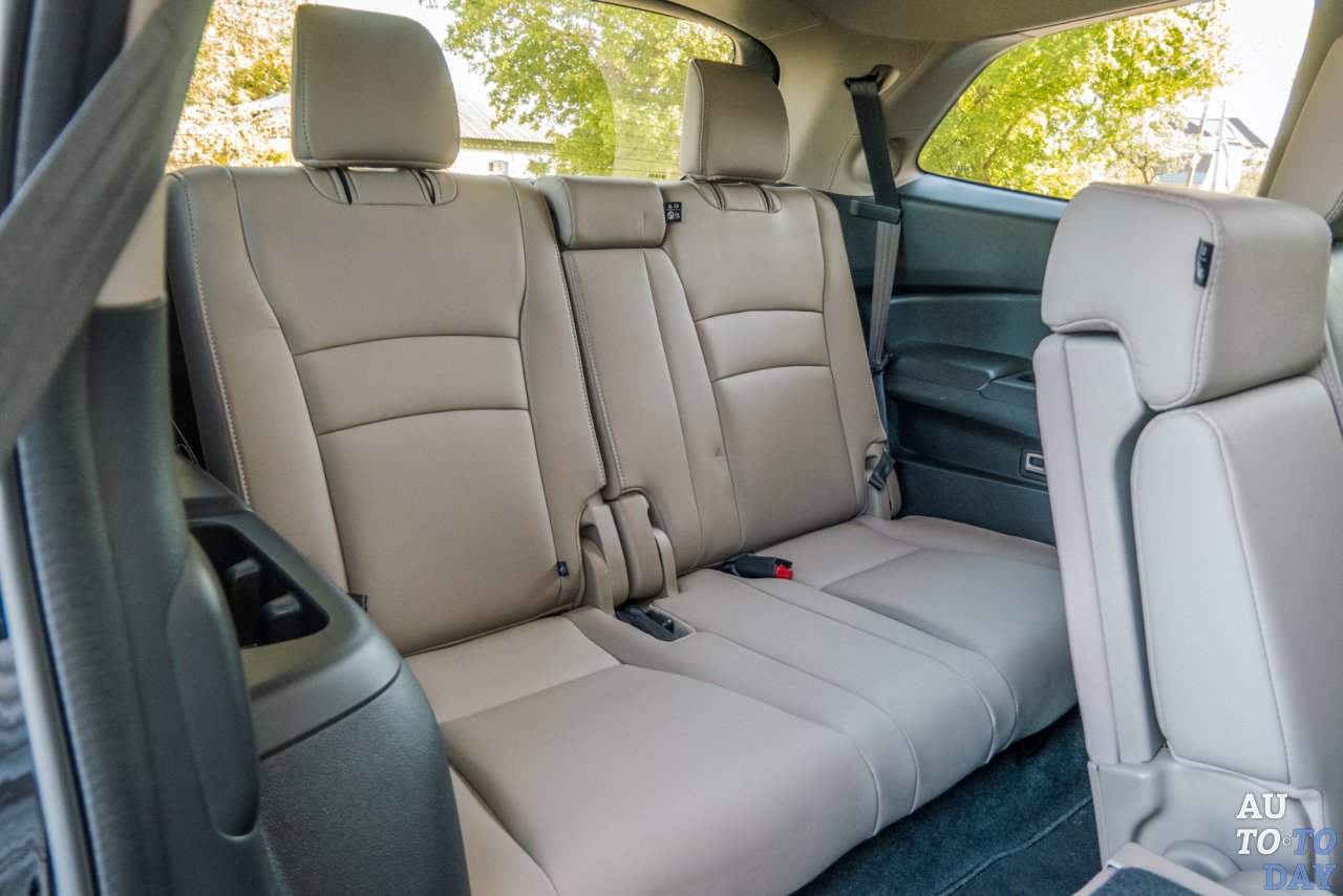 К водительскому месту вопросов нет – перфорированная кожа, подогрев, вентиляция, неплохая боковая поддержка. Только с непривычки ногой можно зацепить педаль стояночного тормоза. Второй ряд имеет продольную регулировку (в соотношении 60/40) и по углу наклона спинки (в диапазоне 15 градусов). Третий ряд официально трехместный. Конечно, он создан для детворы. Взрослые ощутят нехватку места для ног.