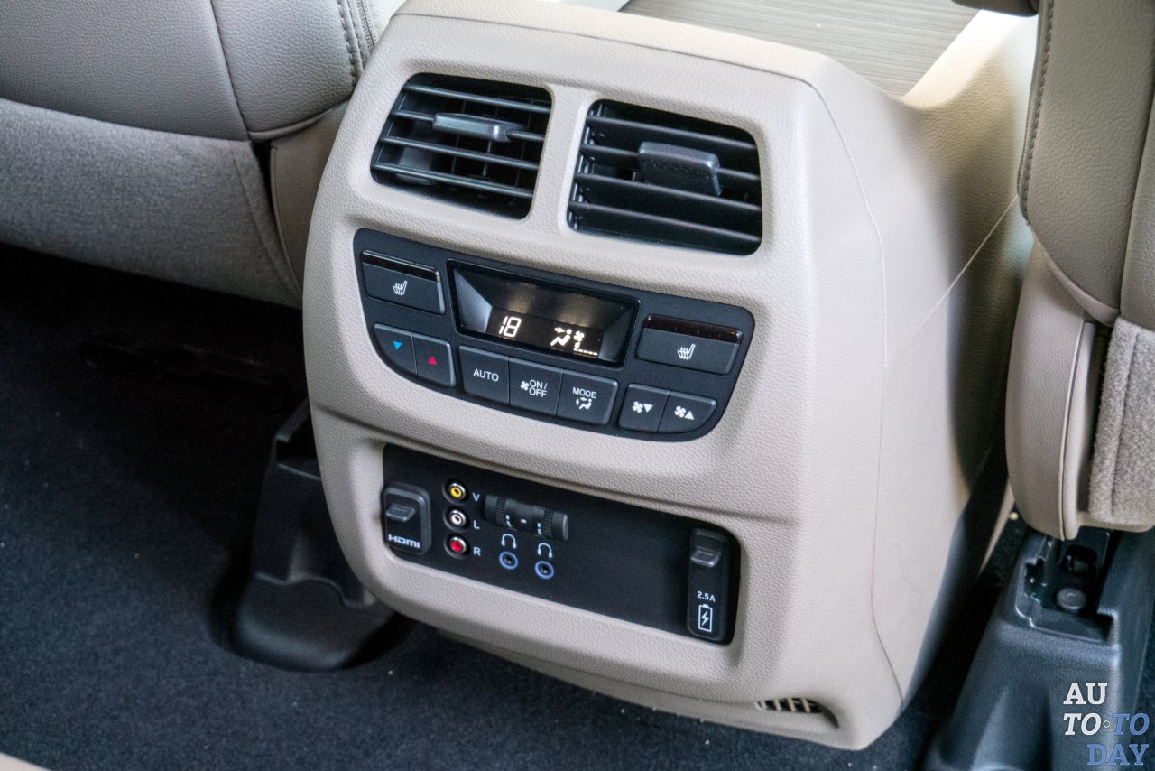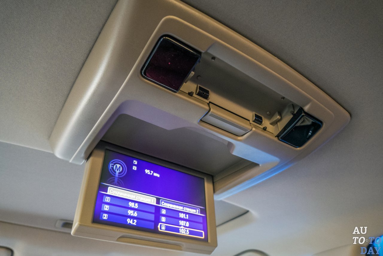 Второму ряду кроме традиционного в классе подогрева сидений и своего климат-контроля, предложен откидывающийся 9-дюймовый телевизор с собственным пультом дистанционного управления. Смотреть можно как фильмы с DVD, так и считывать аудиофайлы с «флешек» и AUX, входы HDMI и RCA. Чтобы не мешать водителю, сзади имеются два разъема для наушников. Также пассажиры могут не переживать за севшие девайсы. Порты USB разбросаны по машине щедро, также присутствует розетка на 220 вольт.