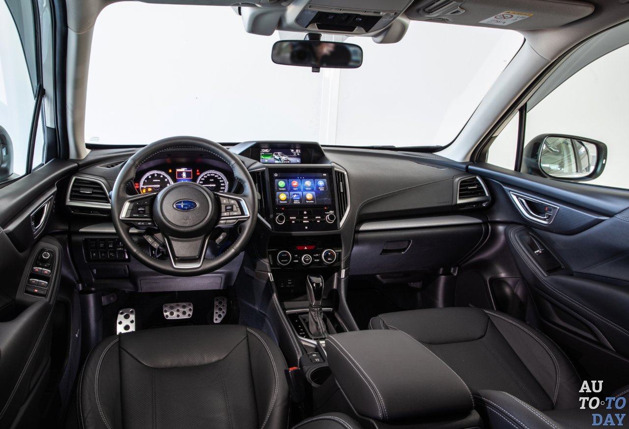Салон всех новых «Субариков» строится по общей формуле, но все же имеет некоторые стилистические отличия. Торпедо выполнено из мягких сортов пластика, и имеет вполне логичную структуру. Рулевое колесо, хоть на первый взгляд и перегружено кнопками, но их «многоуровность» позволяет ими пользоваться, не подглядывая. Щиток приборов во всех комплектациях имеет два аналоговых циферблата с мелковатой оцифровкой и вертикальный цветной экран по центру. На него преимущественно выводится статус работы активных систем безопасности.