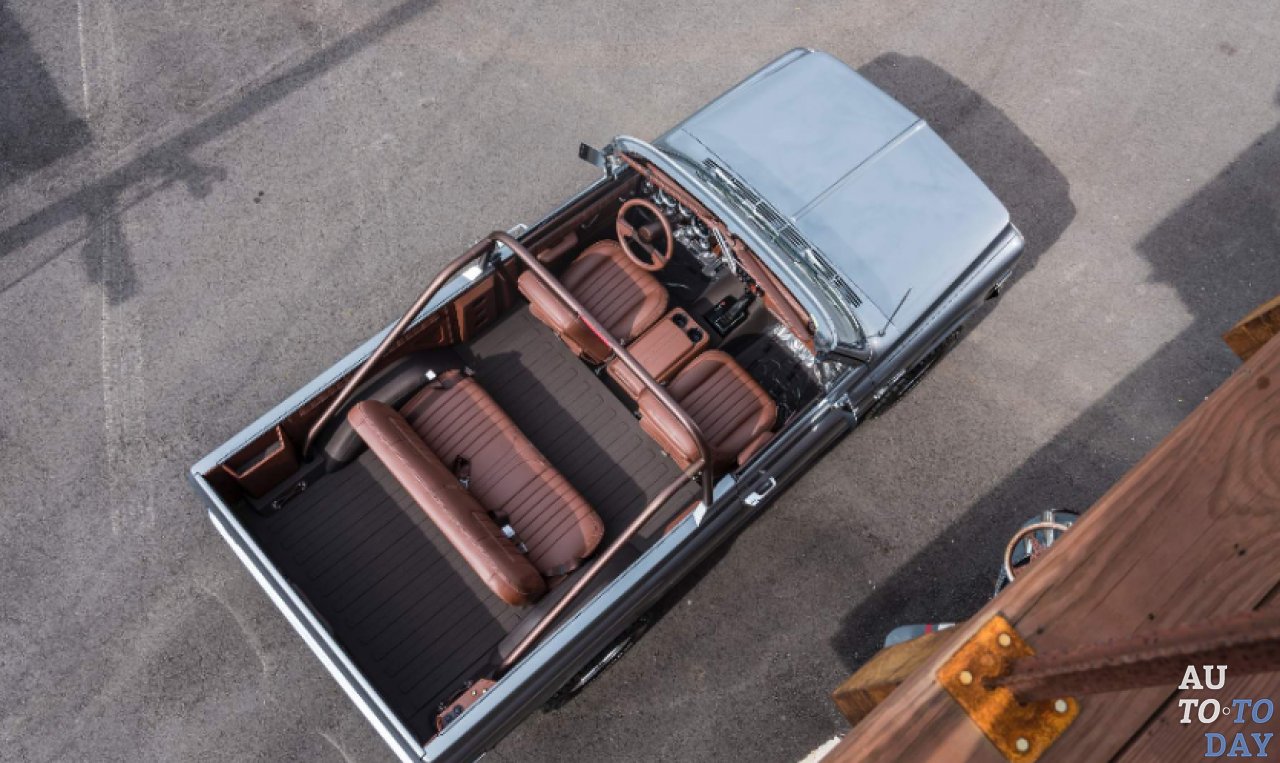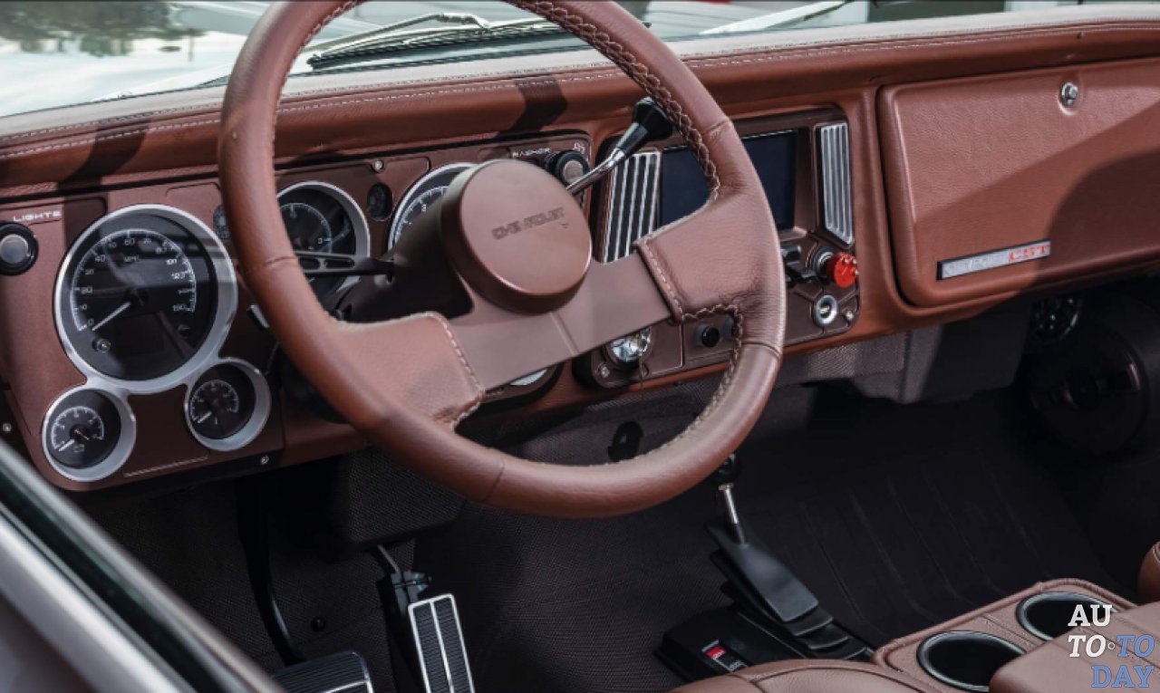 Внутри K5 Blazer применяется современный кожаный салон от Upholstery Unlimited, кондиционер, предоставляемый Vintage Air, и звуковая система с сенсорным дисплеем.