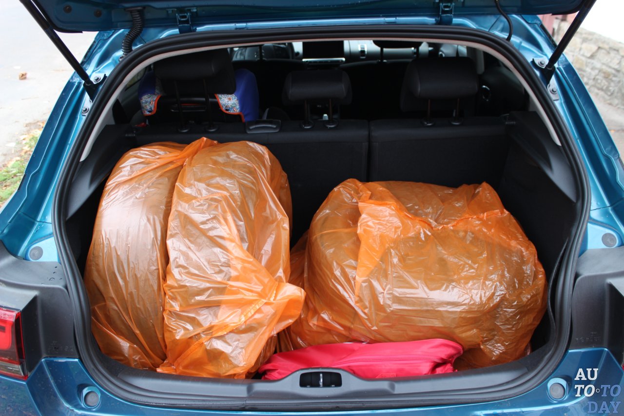 При сложенном втором ряде в багажный отсек уместится 348 литров поклажи. Благодаря правильной форме я туда легко сложил комплект летней резины на дисках. Еще и место для дорожного набора осталось. Если сложить спинку второго ряда, то получим уже 1170 литров. Временное запасное колесо спряталось под полом. Кстати, несмотря на футуризм, «Ситроен» не бежит за модой и не отказывается от «запаски». Это радует.