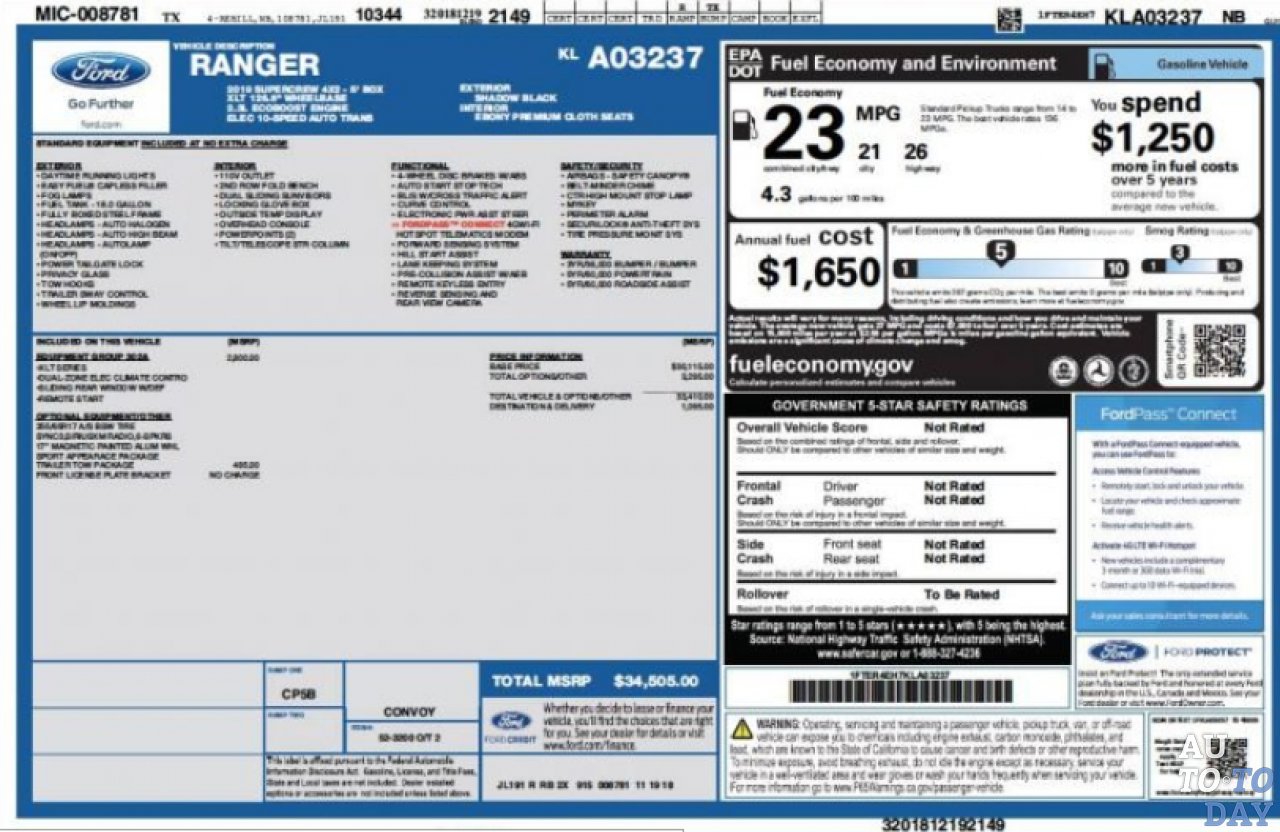 Это связано с тем, что один из участников форума Ranger5G отыскал в сети информацию про Ranger 2WD 2019 модельного года и продемонстрировал официальную наклейку с оценками экономии топлива. Там указано, что автомобиль в четырехдверной конфигурации Supercrew возвращает 21 миль на галлон (11,2 литра на 100 км) при передвижениях по городу, 26 миль на галлон (9,05 литров на 100 км) при поездках по шоссе и 23 мили на галлон (10,23 л/100км) при комбинированном режиме езды. Такие показатели являются лучшими в своем классе. Для сравнения Chevrolet Colorado 2019 года с 2,5-литровым четырехцилиндровым двигателем предоставляет следующую статистику: 11,76 л/100 км по городу, 9,05 л/100 км по шоссе и в среднем 10,69 литров на 100 километров.