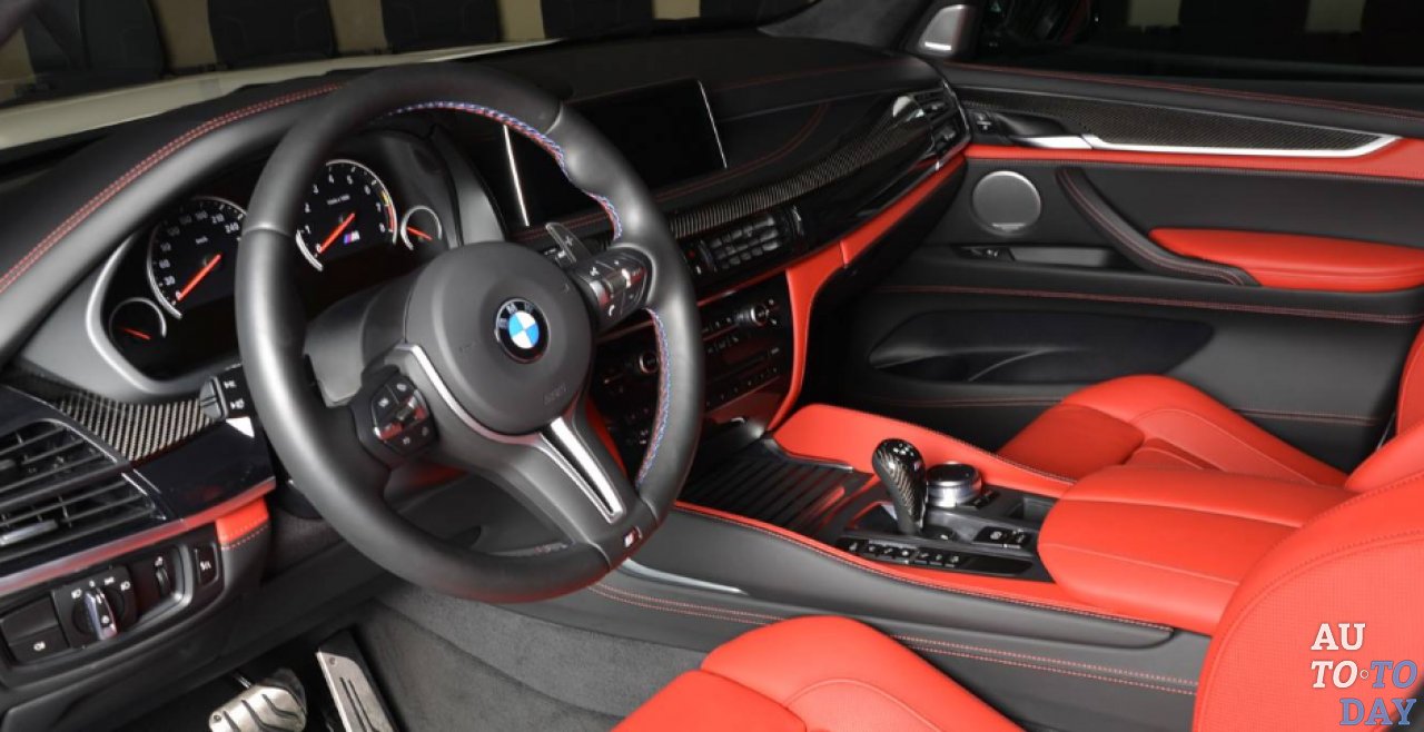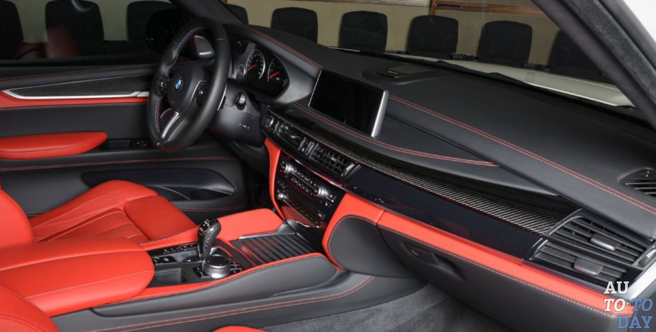 Внутри BMW X5 M присутствует отделка из красной кожи на сидениях, центральной консоли, части дверных панелей и нижней панели. Также свое примирение находит прострочка аналогичного оттенка, идеально сочетающаяся с черным интерьером.