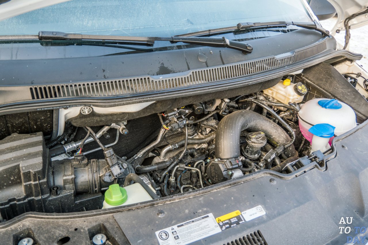 Под коротким капотом Volkswagen Transporter Van Plus поперечно расположился второй снизу по мощности дизельный двигатель – турбоагрегат объемом 2,0 литра и мощностью 103 л. с. Вообще, для модели предлагается широкая линейка бензиновых и дизельных двигателей, но установленный на тестовом авто мотор является самым распространенным. Он устанавливается на «Транспортеры» еще с 2010 года (то есть появился еще на машине предыдущей генерации).