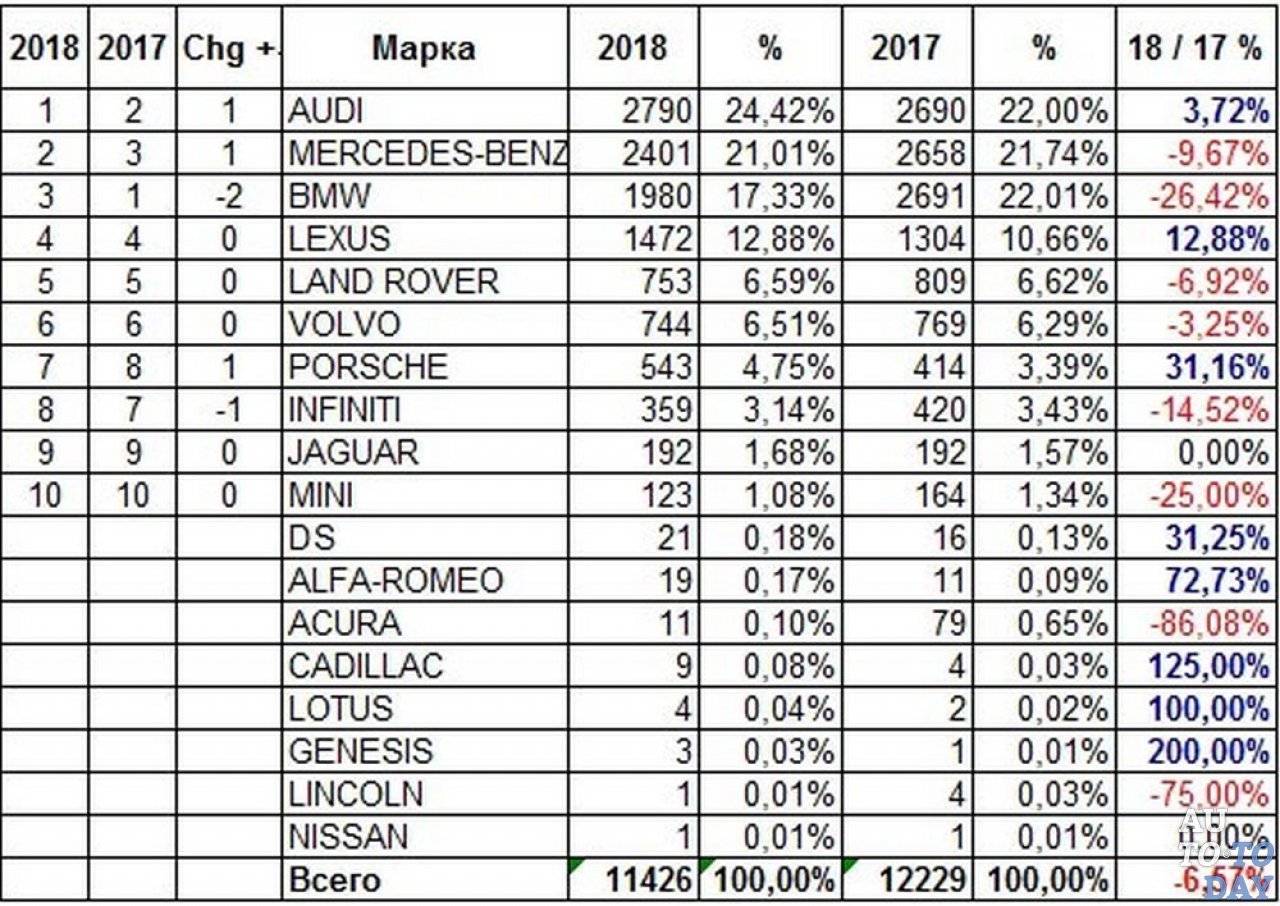 Суммарно рынок премиальных брендов за 2018 год сократился на 6,6% и составил 11 426 автомобилей. Также украинцы стали на 4,4% меньше покупать машины Luxury класса – 87 единиц за год. В общем рейтинге продаж за прошлый год Audi заняла почетное 9 место, тогда как ближайшие премиальные конкуренты Mercedes-Benz и BMW расположились на 12 и 15 местах соответственно.