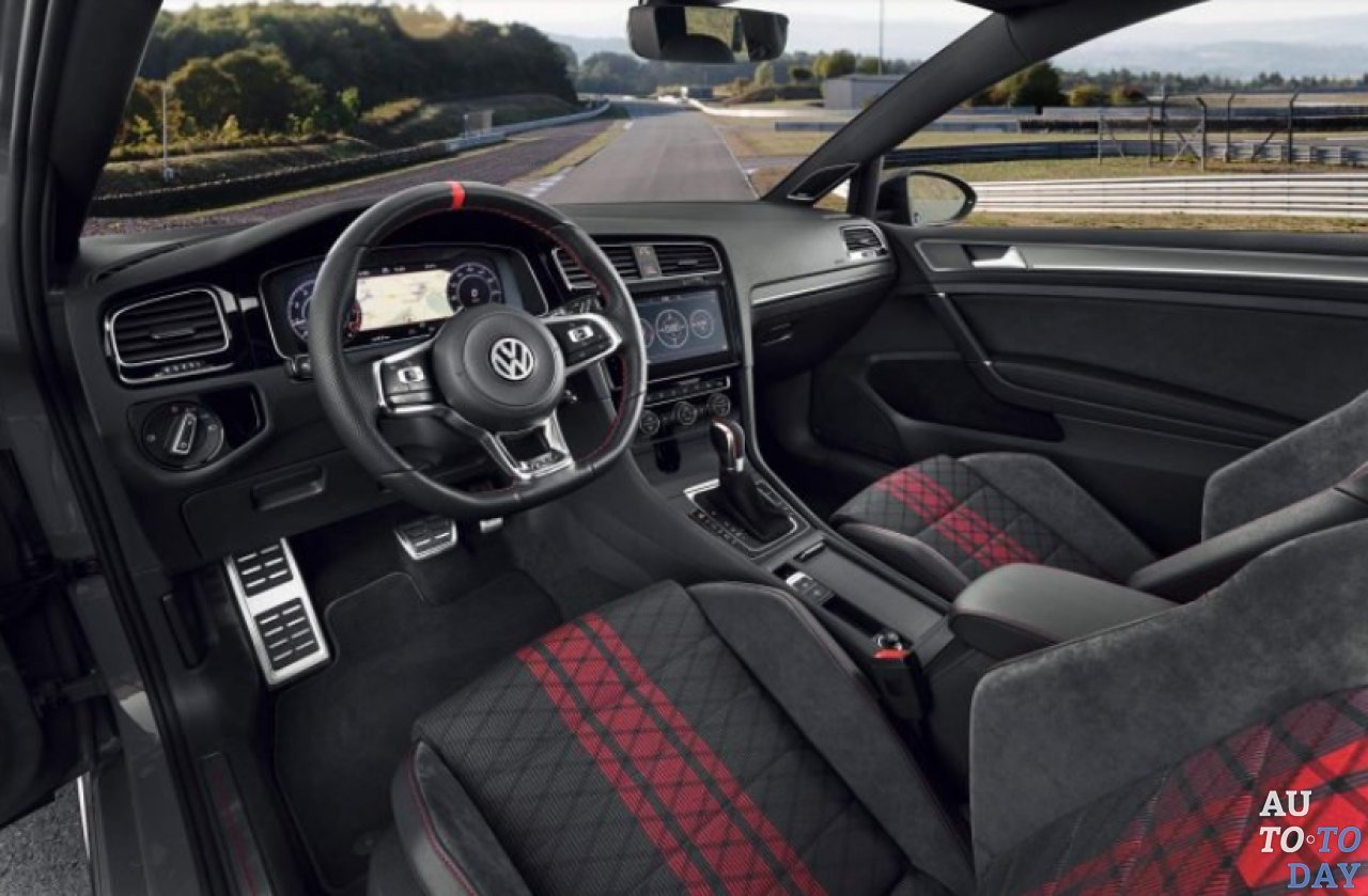 Внутри автомобиль приветствует рулевое колесо с красной полосой и прострочкой, спортивные сидения, обтянутые тканью с особым дизайном, ярко-красная прострочка, присутствующая практически по всей кабине (даже на ремнях безопасности) и другие привлекательные детали. В качестве стандарта Volkswagen Golf GTI TCR предлагает полностью светодиодные фонари, окружающее освещение, датчики дождя, информационно-развлекательную систему, двухзонный климат-контроль Air Care Climatronic, функцию экстренного торможения и распознавания пешеходов.