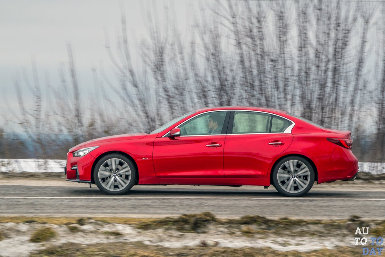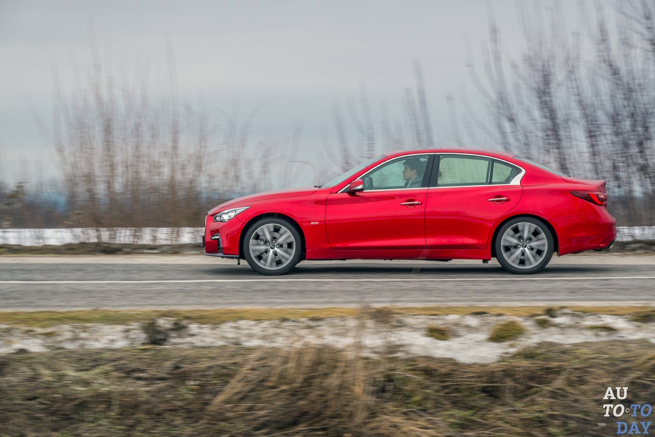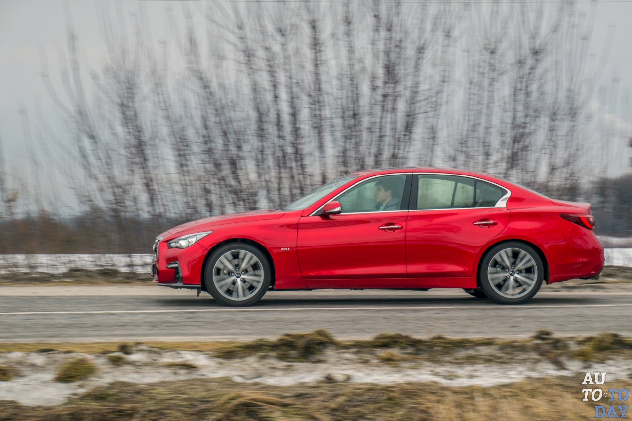 К нам на тест меньший из седанов Infiniti попал в ярко-красном цвете, с приставкой «s» в индексе (которая отвечает за эмоциональный обвес) и турбированным бензиновым двигателем объемом 2,0 литра.
