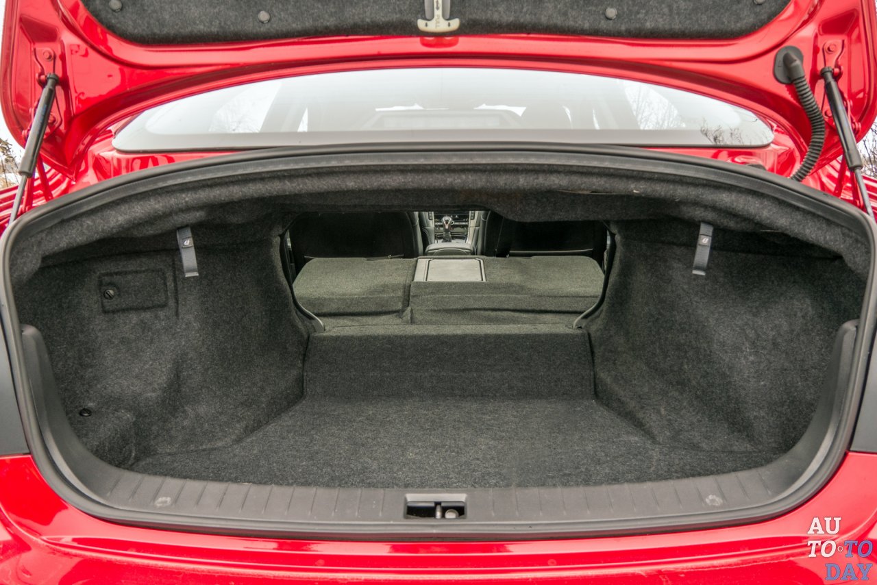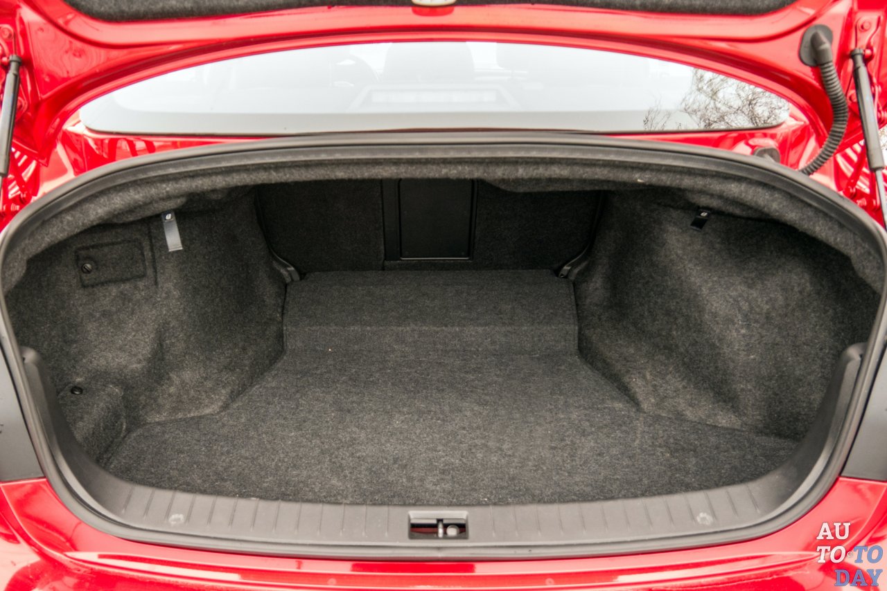 Тестовый автомобиль окрашен в однозначно красивый «динамический красный» специальный металлик, который доступен за дополнительную плату. Всего же для седана предложен десяток цветов. Вообще, модификацию SPORT от остальных можно отличить по более «злой» решетке радиатора, аэродинамическим элементам на переднем бампере и заднему диффузору, который окрашен в цвет кузова.