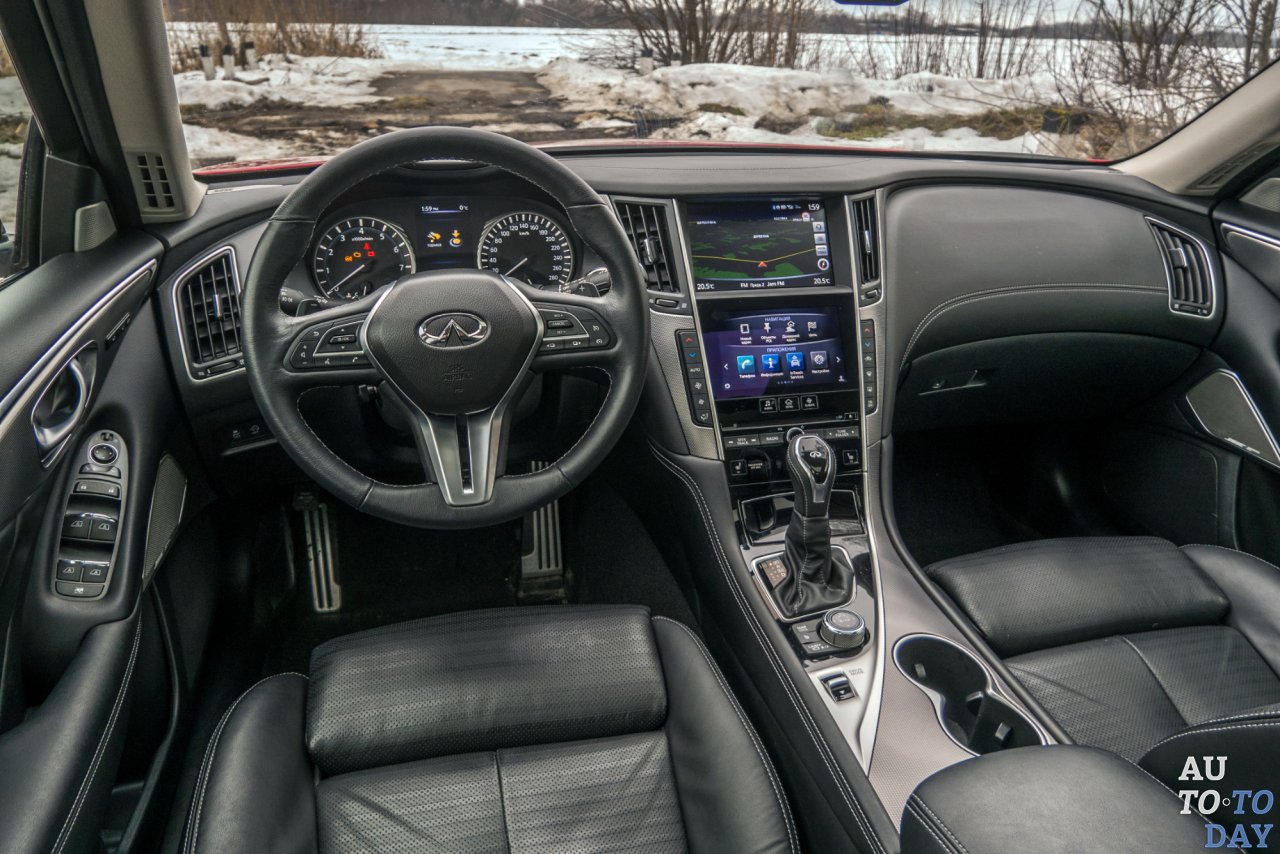 Все предыдущие Infiniti, с которыми мы знакомились ранее, хромали на не самую современную мультимедийную систему. Но компания постепенно исправляется. В Q50s инфотеймент представлен двумя сенсорными дисплеями с диагональю 7 и 8 дюймов. Разработчики попытались разделить их функциональные обязанности. Верхний дисплей рассчитан на навигацию, а нижний – под мультимедийную систему. Но при желании функциональное назначение можно менять. Щиток приборов полностью аналоговый, и состоит из четырех приборов. Между циферблатами разместился 5-дюймовый вертикальный мониторчик. От того, что нет дисплея на для всего щитка ни капельки не грустно – четкие и понятные приборы с лунной подсветкой читаются прекрасно.