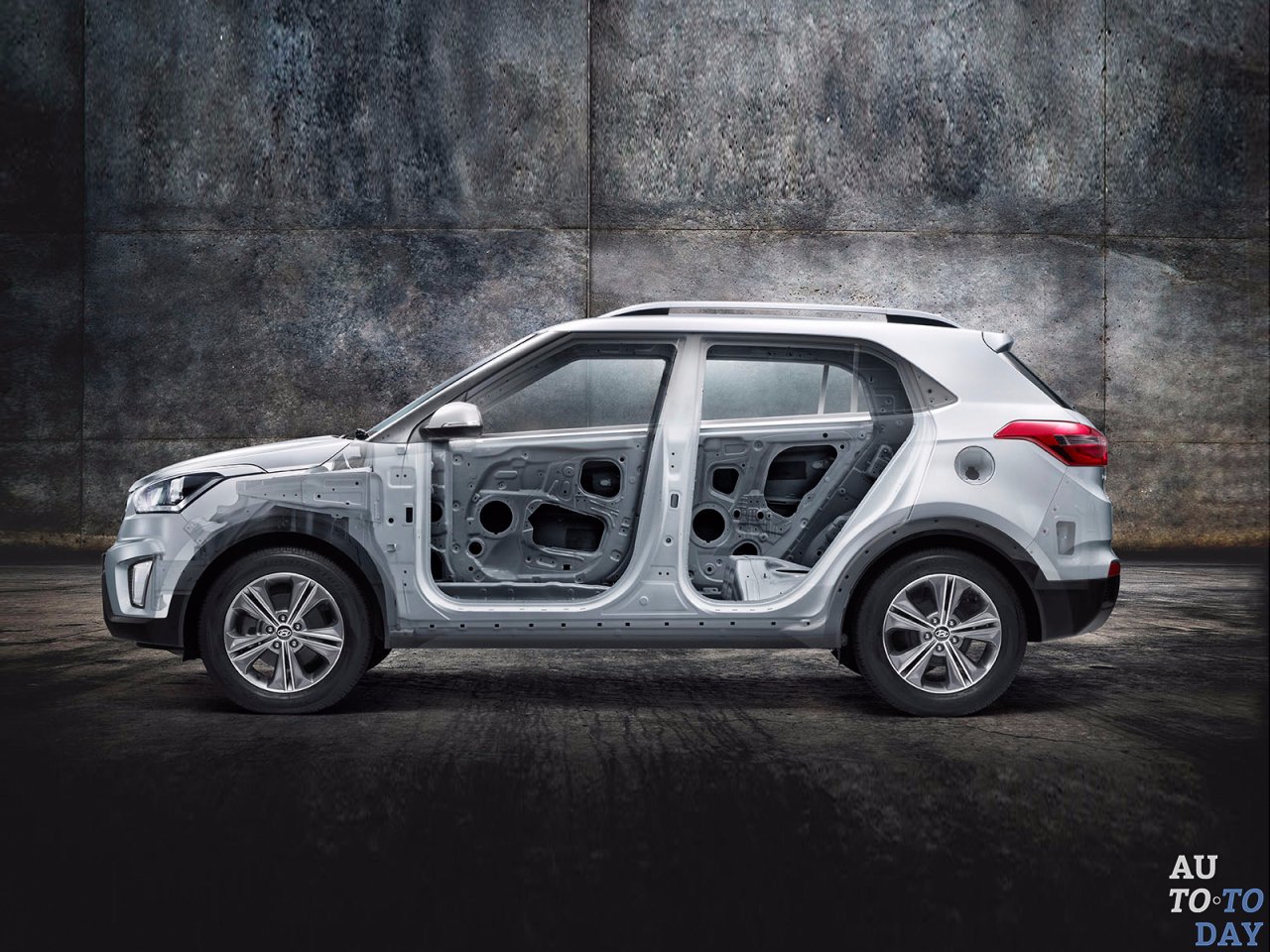Пока нет фото интерьера, но предыдущие эскизы показывают, что он тоже будет похож на салон ix25. Внушительный список опций включает в себя безключевой доступ в салон, сенсорный дисплей, навигационную систему с 1 Гб памяти, климат-контроль с ионизатором воздуха, шесть подушек безопасности, электронную систему контроля устойчивости (ESC) и помощи при трогании. Под оперением Creta имеет каркас кузова с широким использованием высокопрочной стали (AHSS) и Ultra-High-стали (UHSS).