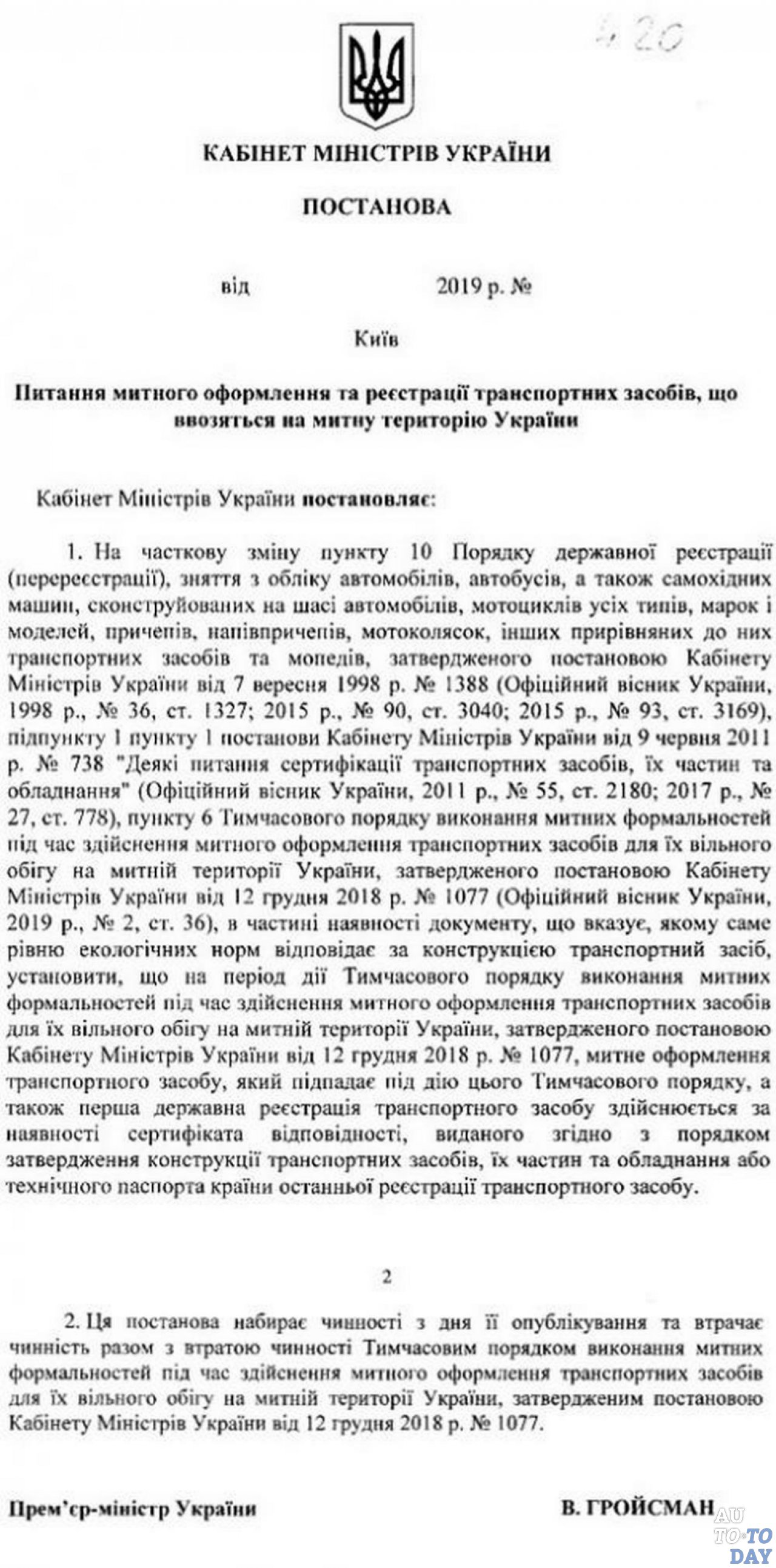 Кабинет министров Украины 13 февраля 2019 года издал постановление, согласно которого упрощается процедуру таможенного оформления и постановки на учет автомобилей с иностранной регистрацией. В частности, теперь не обязательно проходить сертификацию для подтверждения экологического стандарта при таможенном оформлении и первой регистрации авто, передает AUTO-Consulting.