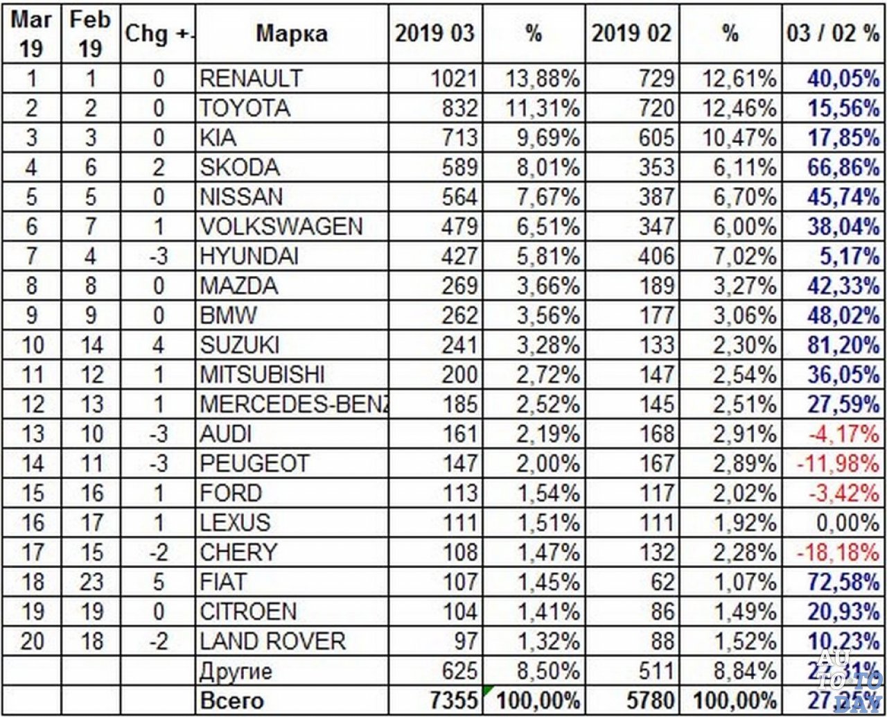 Самой популярной маркой в Украине по итогам мартовских продаж стала Renault – более 1000 реализованных машин за месяц и 40-процентный рост продаж по сравнению с февралем. На втором месте Toyota – 11,3%. Новые модели RAV4 и Corolla обеспечили японскому автопроизводителю +15% рост продаж. С результатом 9,7% замыкает тройку лидеров Kia, а модель Kia Sportage снова стала самой продаваемой в Украине.