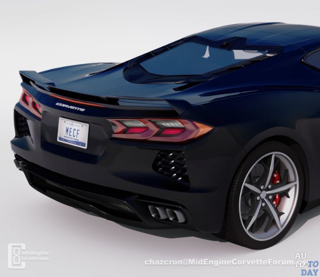 Цифровое изображение, взятое из форума Mid-Engine Corvette Forum, изображает заднюю часть предстоящего Chevrolet C8 Corvette.