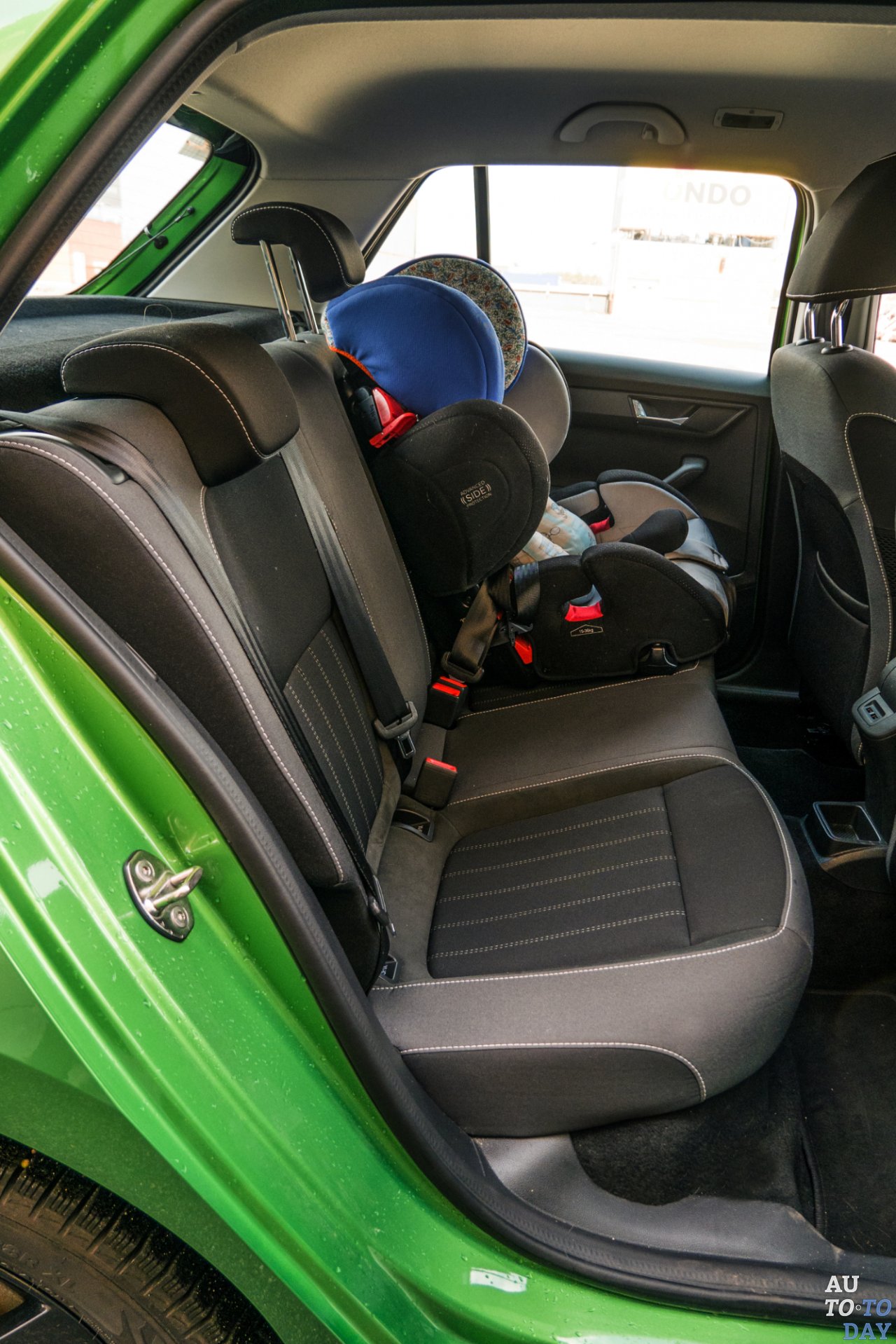 Если говорить о компоновке, функциональности салона и материалах отделки, то «Шкода» в своем репертуаре. Да, в салоне этого хэтчбека вы не увидите поддающийся нажатию пальца пластик, повсюду только твердые его сорта. Но к эргономике вовсе нет замечаний – комфортный мягкий подлокотник, крупные кнопки климат-контроля, оптимальный по форме руль. Салон отлично подойдет для четырех взрослых пассажиров. Троим на втором ряду будет тесновато в плечах, хотя по паспорту машина как раз пятиместная.