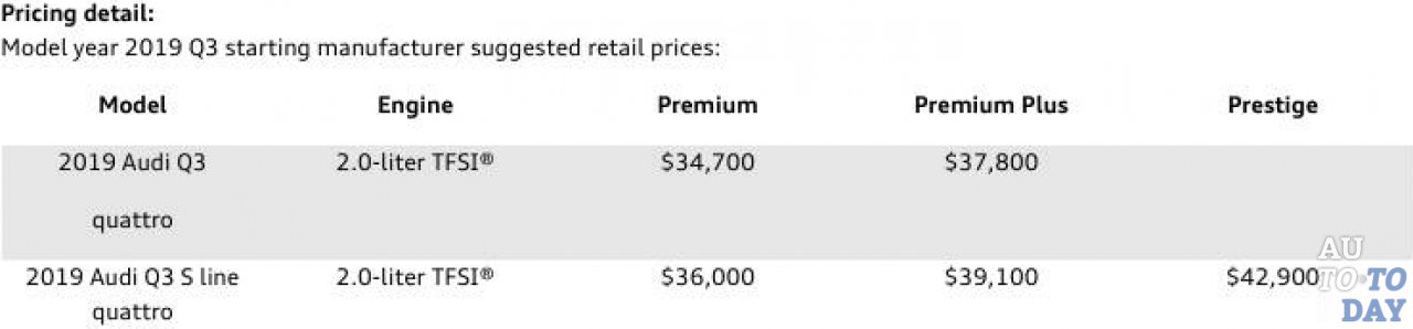 В качестве сопровождения первых фотографией компактного внедорожника, Audi предоставила ассортимент цен, который стартует от 34 700 долларов США (без учета оплаты за транспортировку в 995 долларов и обслуживание).