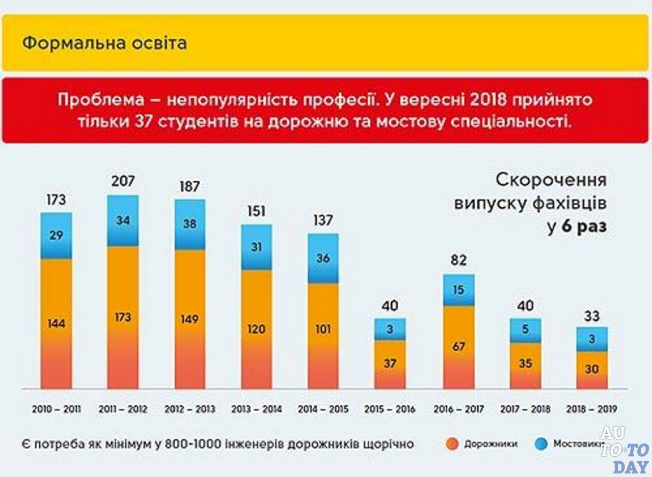Согласно печальной статистике, обнародованной «Укравтодором», в Украине наблюдается острая нехватка специалистов для строительства дорог, передает AUTO-Consulting. Уже сейчас компания не может найти 800-1000 квалифицированных работников –дорожников. А в будущем ситуация может стать еще хуже. Если в 2011 году в украинских вузах на данную специальность училось около 200 человек, то в 2018 их поступило всего 33 человека. Из них , инженерами-мостостроителями могут стать всего 3 человека.