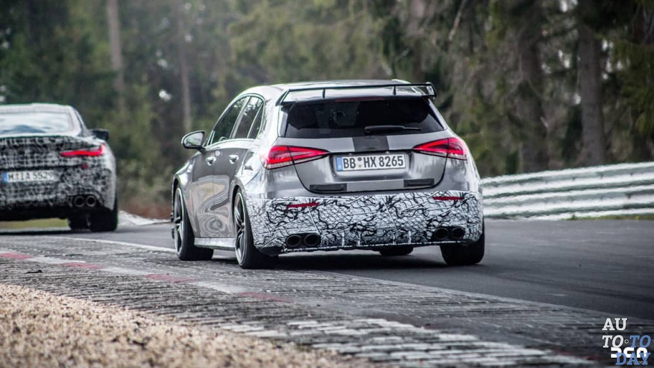Новый Mercedes-AMG A45, запечатленный на фотографиях, имеет минимальный камуфляж, немного скрывающий переднюю и заднюю панели. Он позволяет рассмотреть более спортивный стиль по сравнению с AMG A35, пересмотренную решетку радиатора с вертикальными планками, выразительный спойлер на крыше и выхлопную систему с четырьмя выхлопными трубами.