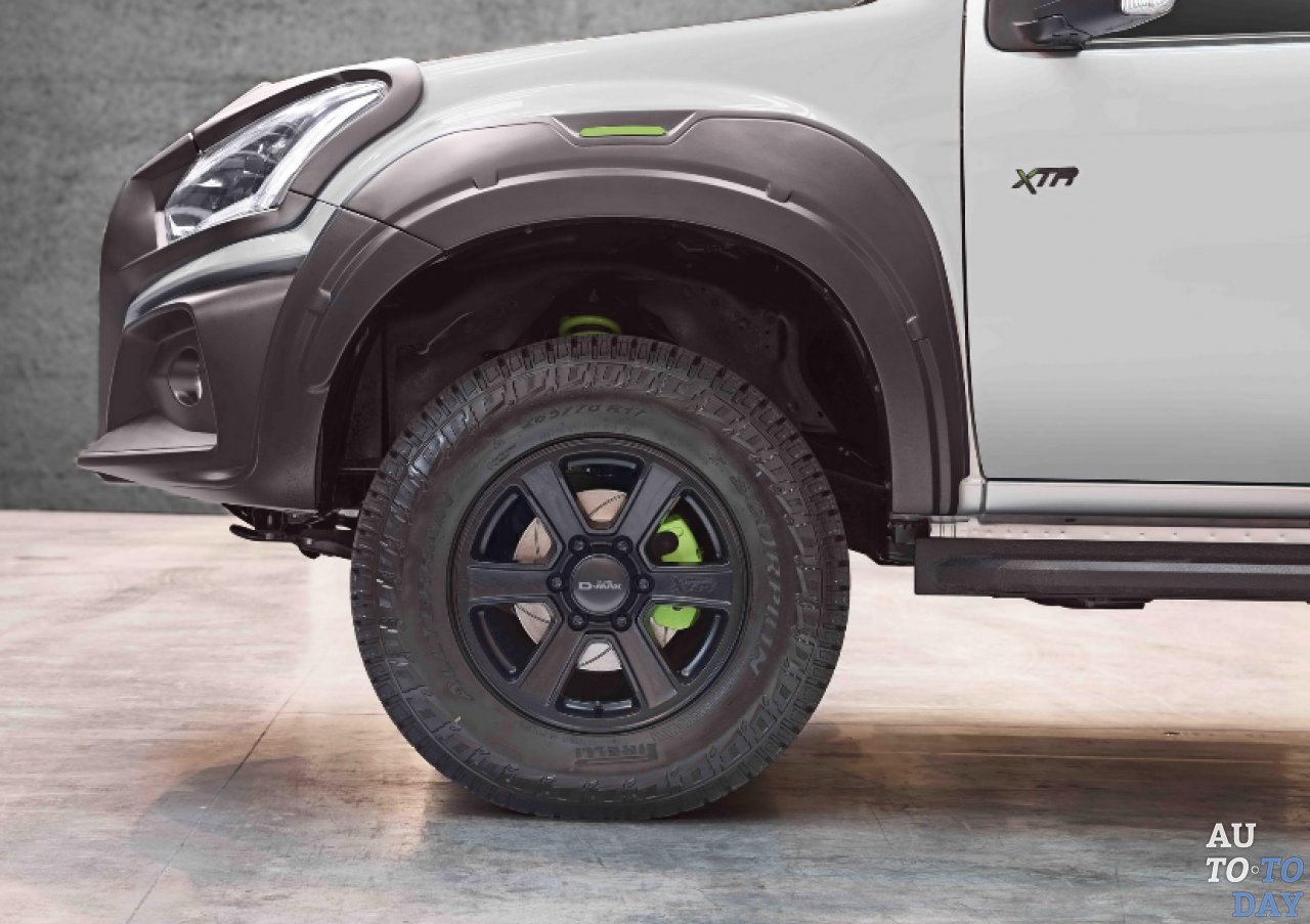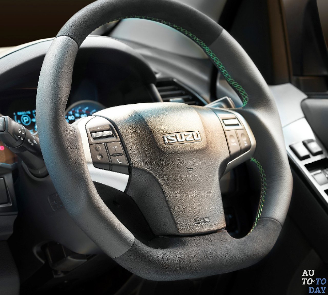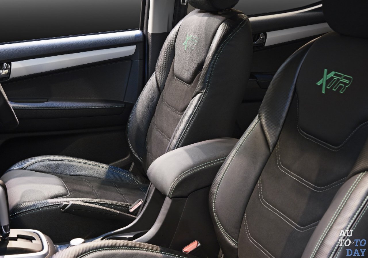 Что касается цветовой палитры, пикап доступен в оттенках Splash White, Titanium Silver Met, Obsidian Grey Mica и Cosmic Black Mica, идеально контактирующих с ярким зеленым (присутствует на отдельных компонентах подвески и тормозной системы). Внутри Isuzu D-Max XTR предлагает спортивные передние сидения с подогревом и отделкой из кожи и углеродного волокна, контрастную строчку и вышитые логотипы.