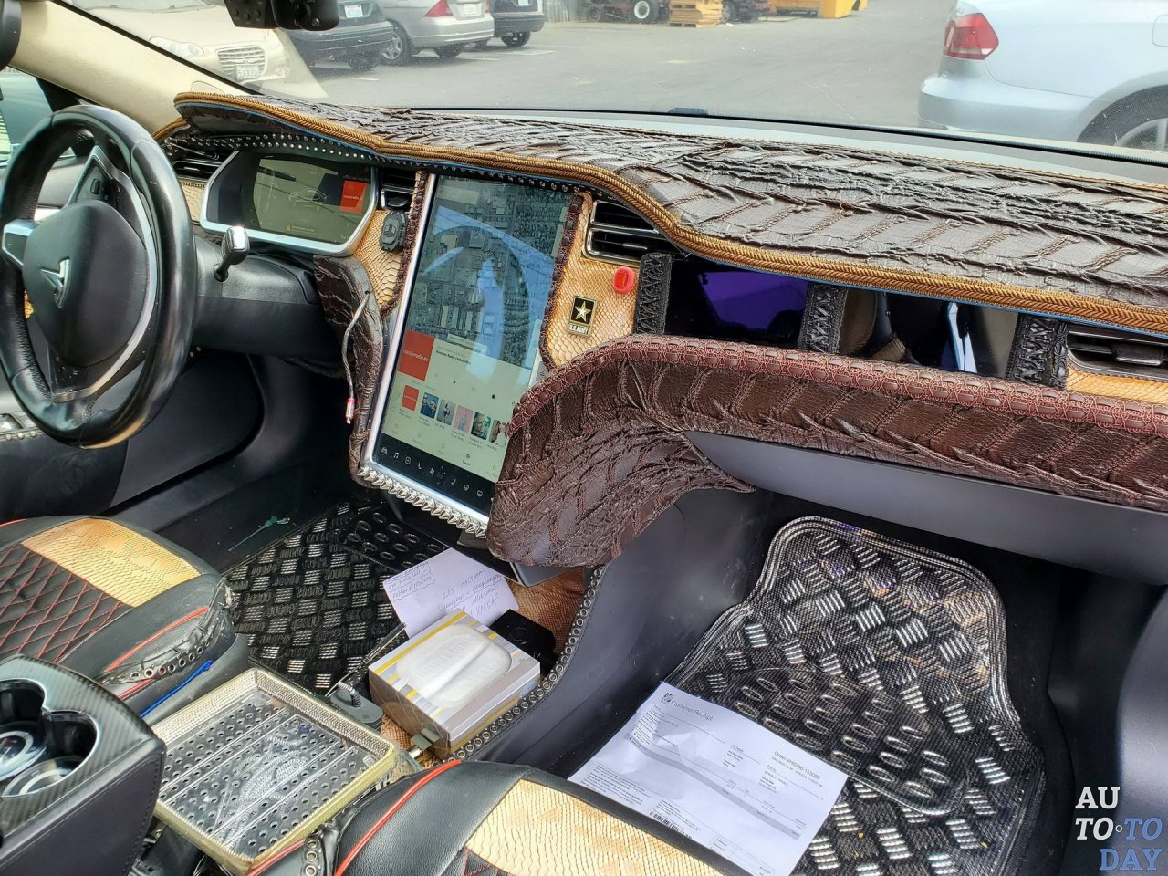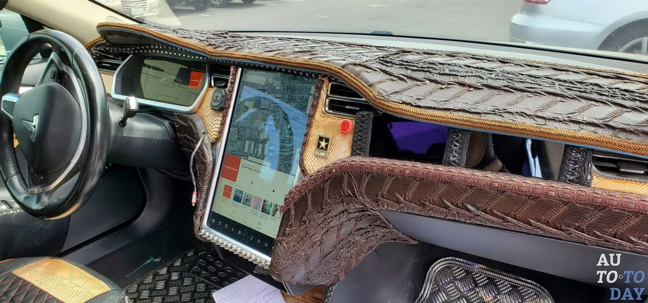 Tesla Model S, изображенная на снимках, демонстрирует салон с множеством кожи и нестандартных акцентов. Используемые материалы выглядят так, как будто они получены с чьих-то ковбойских сапог или целого ассортимента кошельков их крокодиловой кожи. Все швы и отделка выглядят очень эффектно и одновременно вызывающее, играя на контрастных, массивных швах и нетипичных деталях. Здесь все уникально, начиная с комфортных сидений, совмещающих светло-оранжевые, коричневые, красные и черные элементы, заканчивая рельефной реализацией приборной панели и других компонентов управления.