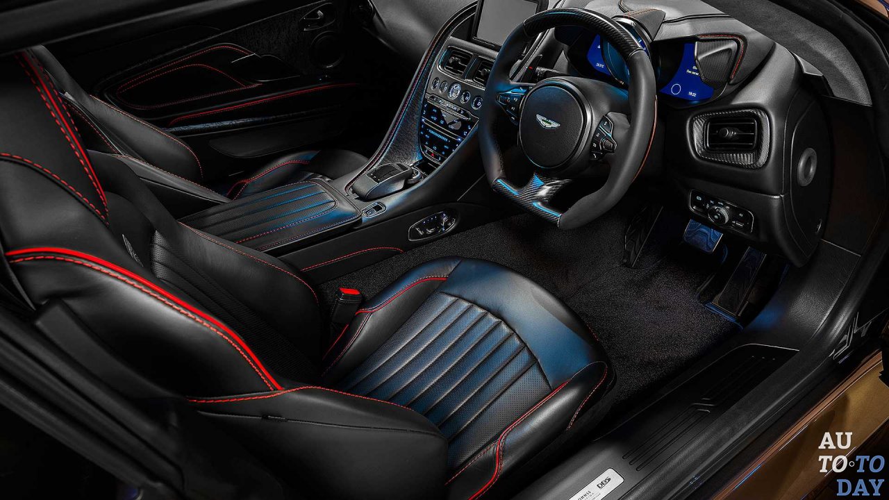 Британский суперкар, достойно названный «On Her Majesty’s Secret Service DBS Superleggera», обладает множеством отличительных элементов (сплиттер из углеродного волокна, специально разработанную решетку и окраску Olive Green). Внутри клиентов приветствует черная кожа с акцентами из алькантары, как в оригинальном Aston Martin DBS 1969 года, красные акцента на центральной консоли и сидениях, а также система Bang & Olufsen BeoSound в комплекте с сабвуфером.