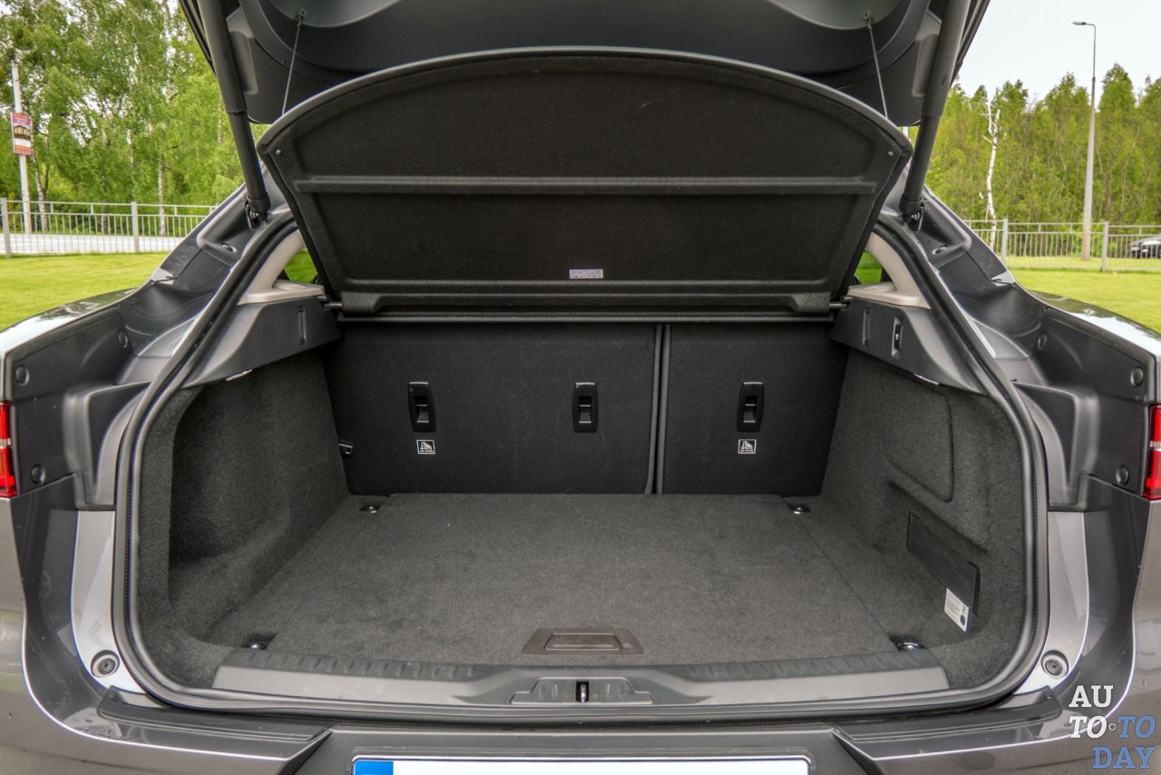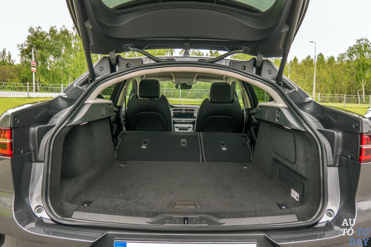 Отдельных багажных отсеков у «Ягуара» два. Передний – скромный, объемом всего 30 литров. В него аккурат уместятся два кабеля для бытовой и быстрой зарядки. Под капотом (здесь же) из сервисных возможностей – только горловина залива «омывайки». Под массивной пластиковой плитой спрятались электродвигатель и редуктор привода передней оси, блок управляющей электроники, бортовое зарядное устройство, инвертор-преобразователь тока, а также компоненты системы кондиционирования, отопления и охлаждения. 656 литров – именно таков объем основного багажника с вариантом ремкомплекта для шины. Если заказать опциональную «докатку», то это значение сократится на 20 литров. Со сложенным вторым рядом получаем 1453 свободных литра. Правда, сильно скошенная крышка багажника несколько отнимает свободы при перевозке объемных грузов. Но не каждый же день «Ягуаром» морозильные камеры возить.