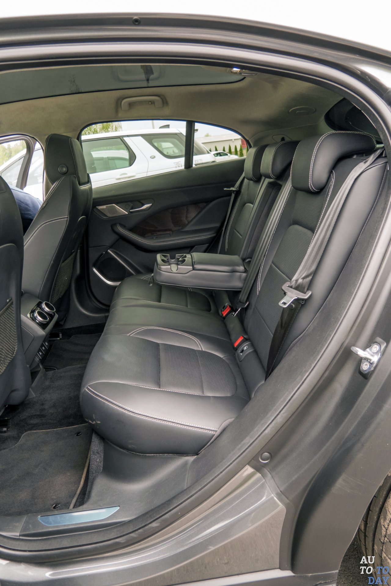 Выдвигающиеся дверные ручки мы уже встречали на Range Rover Velar, также они стали появляться и на других моделях группы JLR. Фигурная огромная панорамная крыша не имеет шторки, но снабжена автоматическим затемнением, так что про «ослепление» в солнечную погоду беспокоиться не стоит – проверено. Для «Ягуара» предложены колесные диски трех размеров – на 18, 20 и 22 дюйма. На тестовом авто установлен средний вариант.