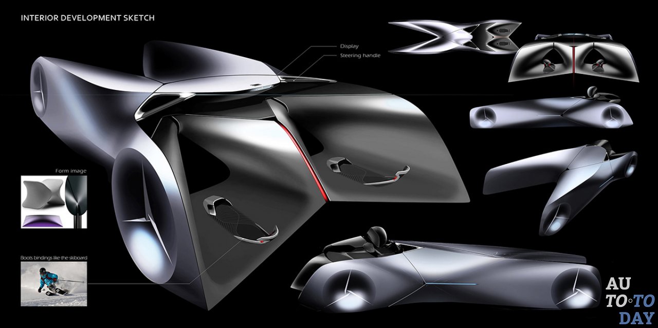 Разработка, включающая четыре колеса, как в обычно автомобиле, значительно отличается от любого другого транспортного средства, присутствующего на рынке. Для начала, она исключает использование типичной передней панели и выполнена в форме буквы «Х» с значительным расстоянием между передними колесами и аналогичной пустотой между задними.