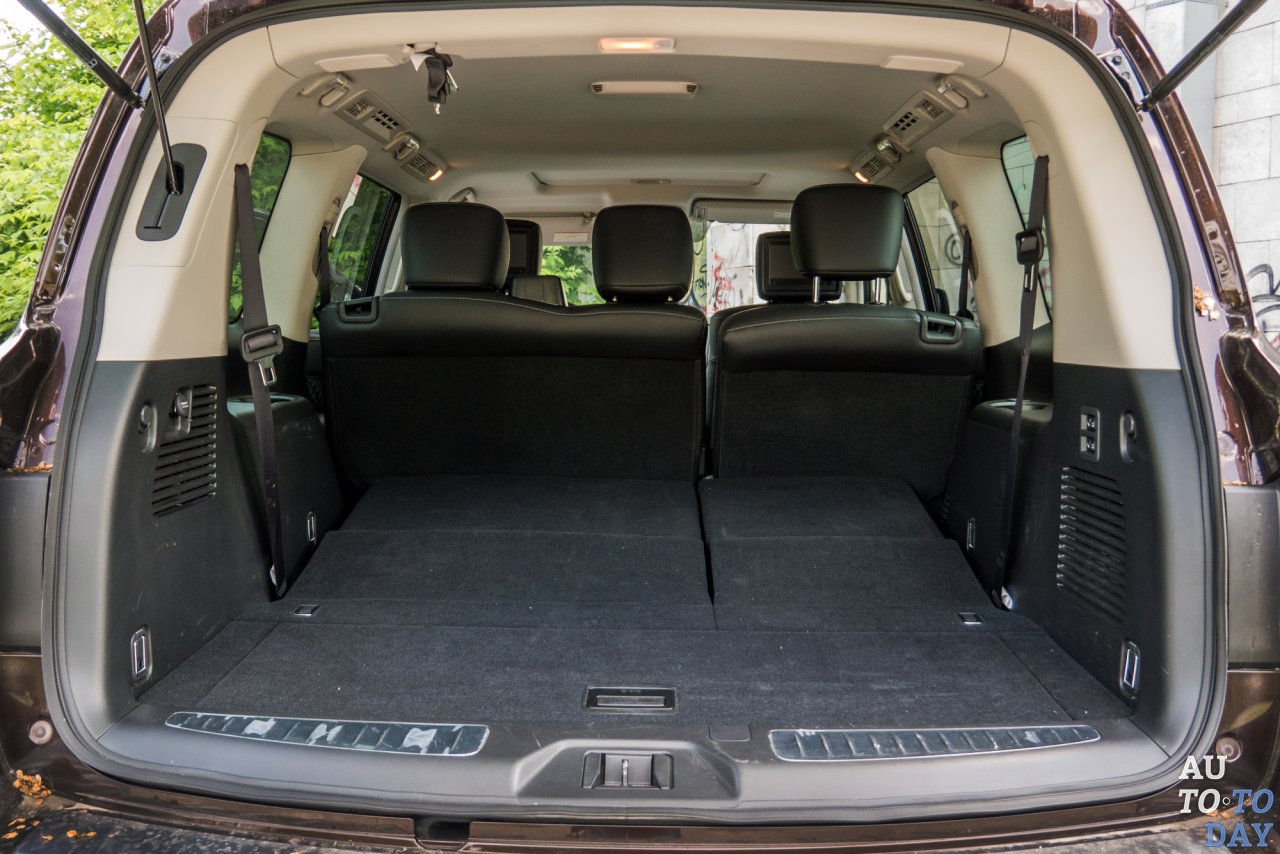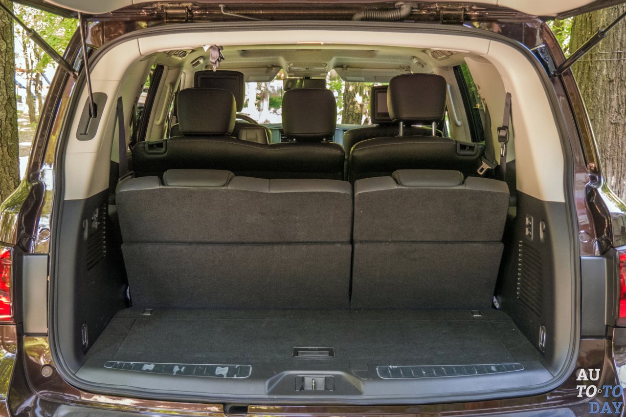 470 литров – это объем багажного отсека при разложенных трех рядах сидений. Если оставить только два передних места, то получим почти «фургонное» значение в 2694 литра. Сложить спинки можно как с багажника, так и с водительского места. Естественно, все с помощью электроприводов. Традиционно для класса больших внедорожников, запасное колесо расположено под кузовом. И оно является низшей точкой машины при движении задним ходом.