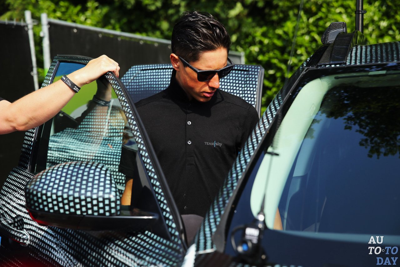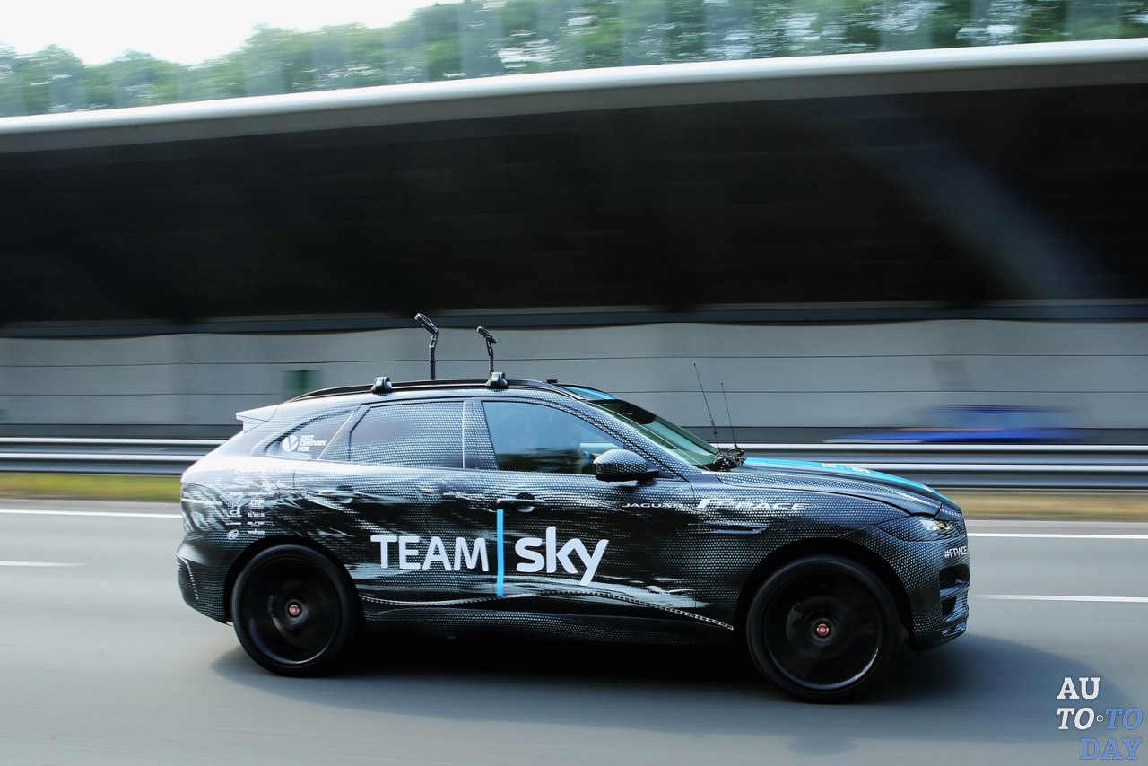 Jaguar поддержал пять гонщиков Team Sky (Ян Станнард, Люк Роу, Питер Кеннау, Леопольд Кёниг и Крис Фрум) во время гонки. Интересно, что в ходе гонки машина не была лишена всего камуфляжа. Автомобиль был оснащен велосипедной стойкой, разработанной специально для сцены, чтобы нести два запасных велосипеда команды Team Sky. Стойки были разработаны с инновационной системой телескопических зажимов инженерами Jaguar Land Rover.