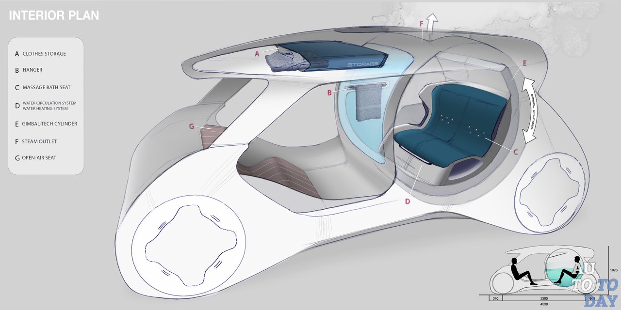 Кто бы мог подумать, что в будущем в автомобиле может быть встроенный горячий источник, позволяющий наслаждаться теплой ванной?