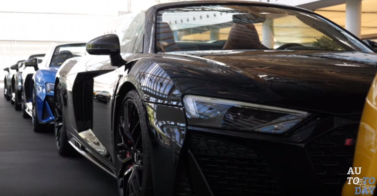 Среди показанных суперкаров с двигателями V10, особое внимание привлекает R8 Spyder, окрашенный в оттенок Vegas Yellow. Также выделяется модель Performance, оснащенная фиксированным задним крылом и рядом других компонентов, выполненных на заказ. Остальные транспортные средства выглядят тоже достойно и закончены в различных привлекательных оттенках, например, синем, который, кажется, очень хорошо вписывается в общую форму автомобиля.