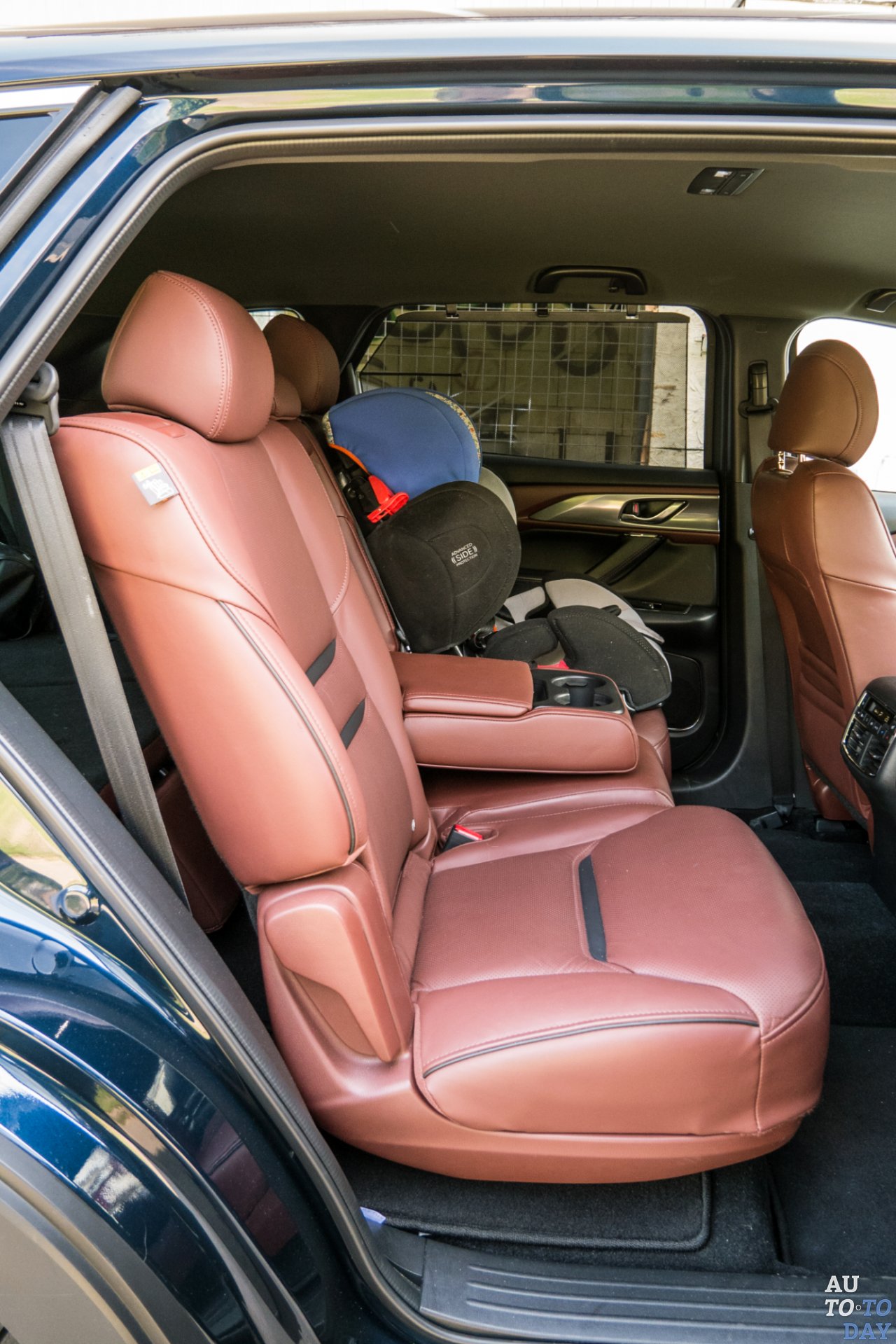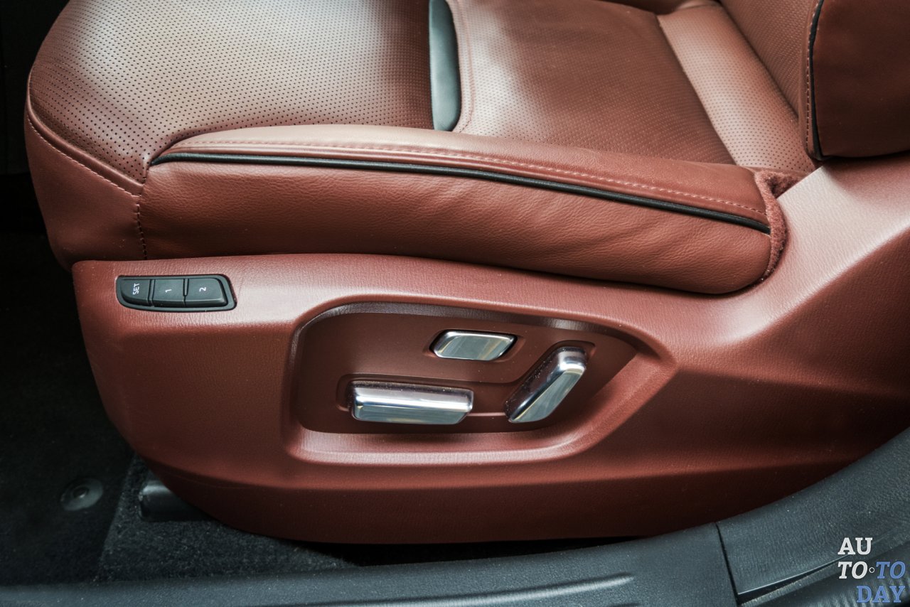 В максимальной комплектации Executive появились варианты цвета отделки интерьера. Правда, выбрать можно только черный, или вишневый. У нас на тесте был более яркий вариант. Интересно, что в топовой комплектации кожей Nappa обтянуты все три ряда сидений. Передняя пара кресел окромя трехуровневого подогрева также получила и вентиляцию с тремя уровнями регулировки. Честно, после того, как машина простаивала несколько часов на солнце, эта функция была очень полезна. За считанные минуты кресло охлаждалось полностью.
