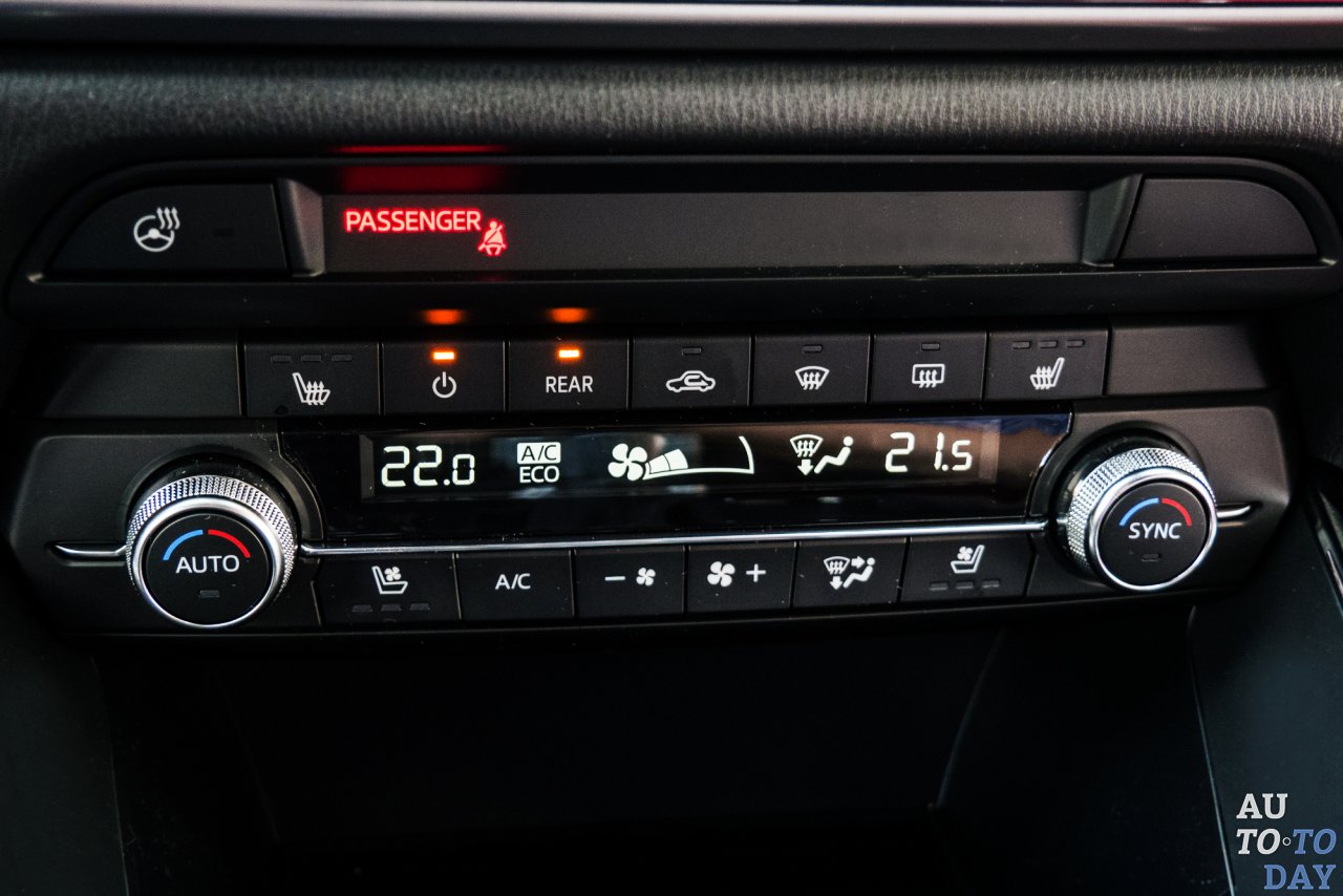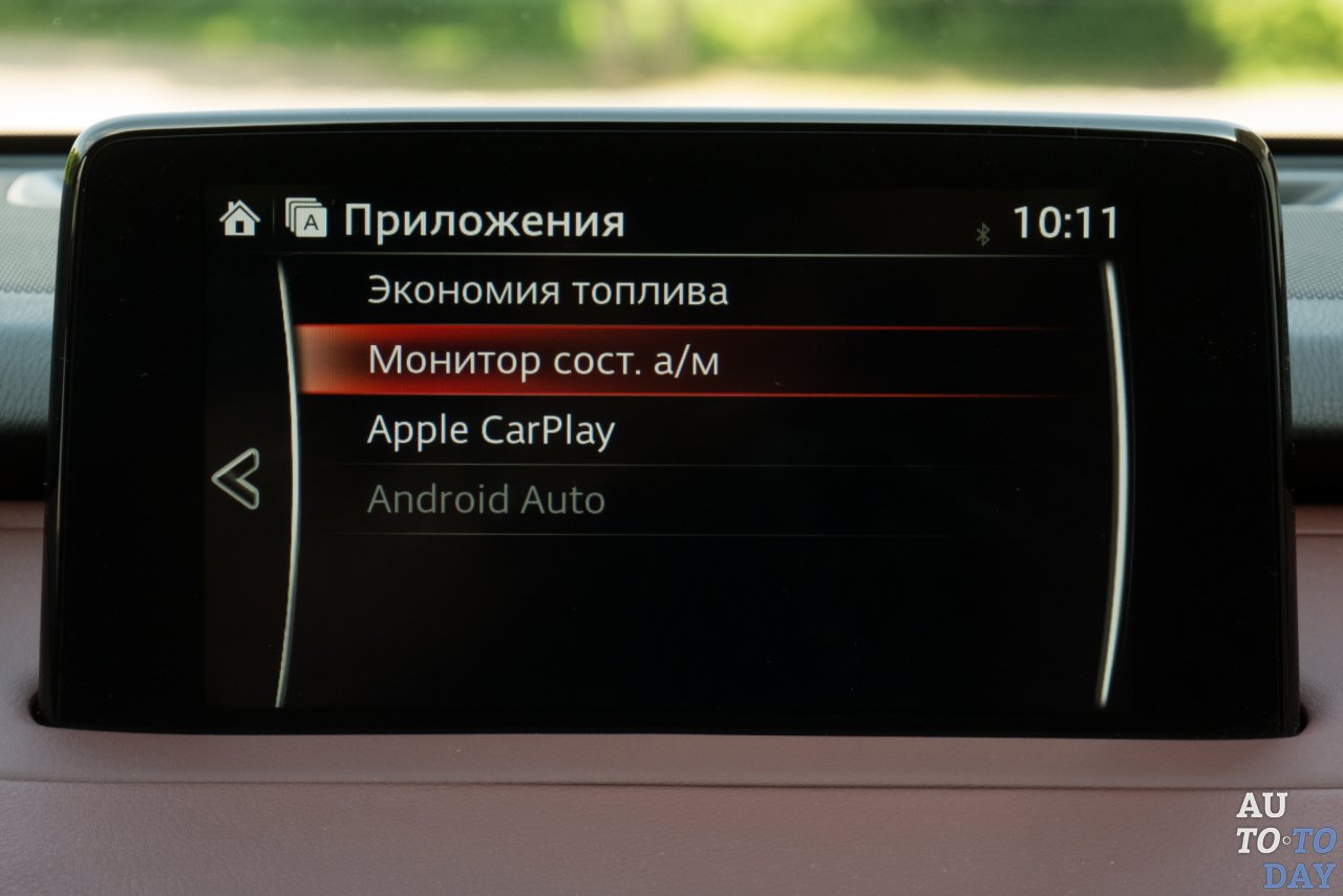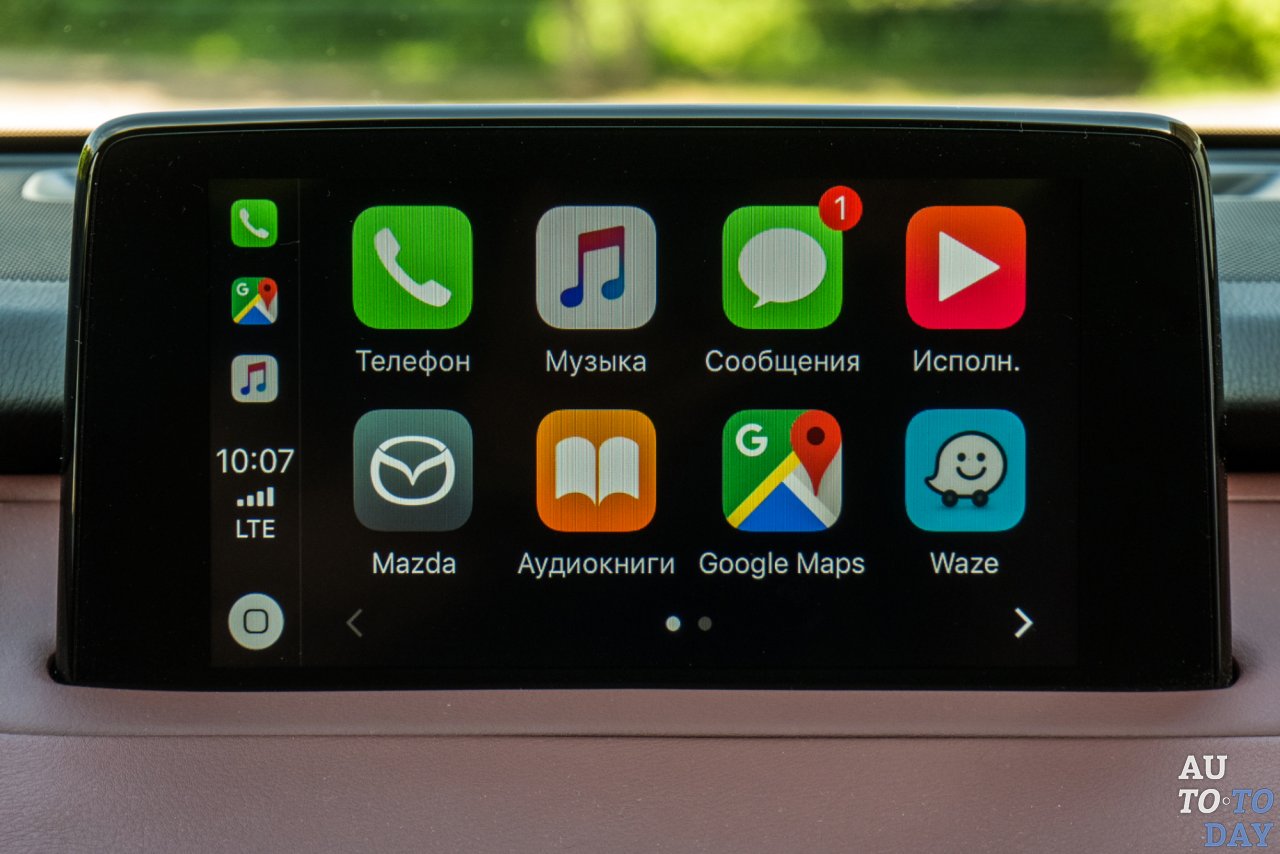 Поддержка протоколов связи со смартфонами Android Auto и Apple CarPlay пришла в большой кроссовер от «Мазды». Ура! Широкоформатный дисплей мультимедиа отлично подходит для отображения всех иконок в два ряда. Сенсорное управление очень органичное. Правда, после 8 км/ч монитор перестает воспринимать касания пальцев, и все управление остается на джойстике, что прописался на центральном тоннеле. Четыре камеры кругового обзора имеют ярко выраженные стыки. При этом порядок камер можно конфигурировать на своё усмотрение. Качество изображения сильно ухудшается в темное время суток.
