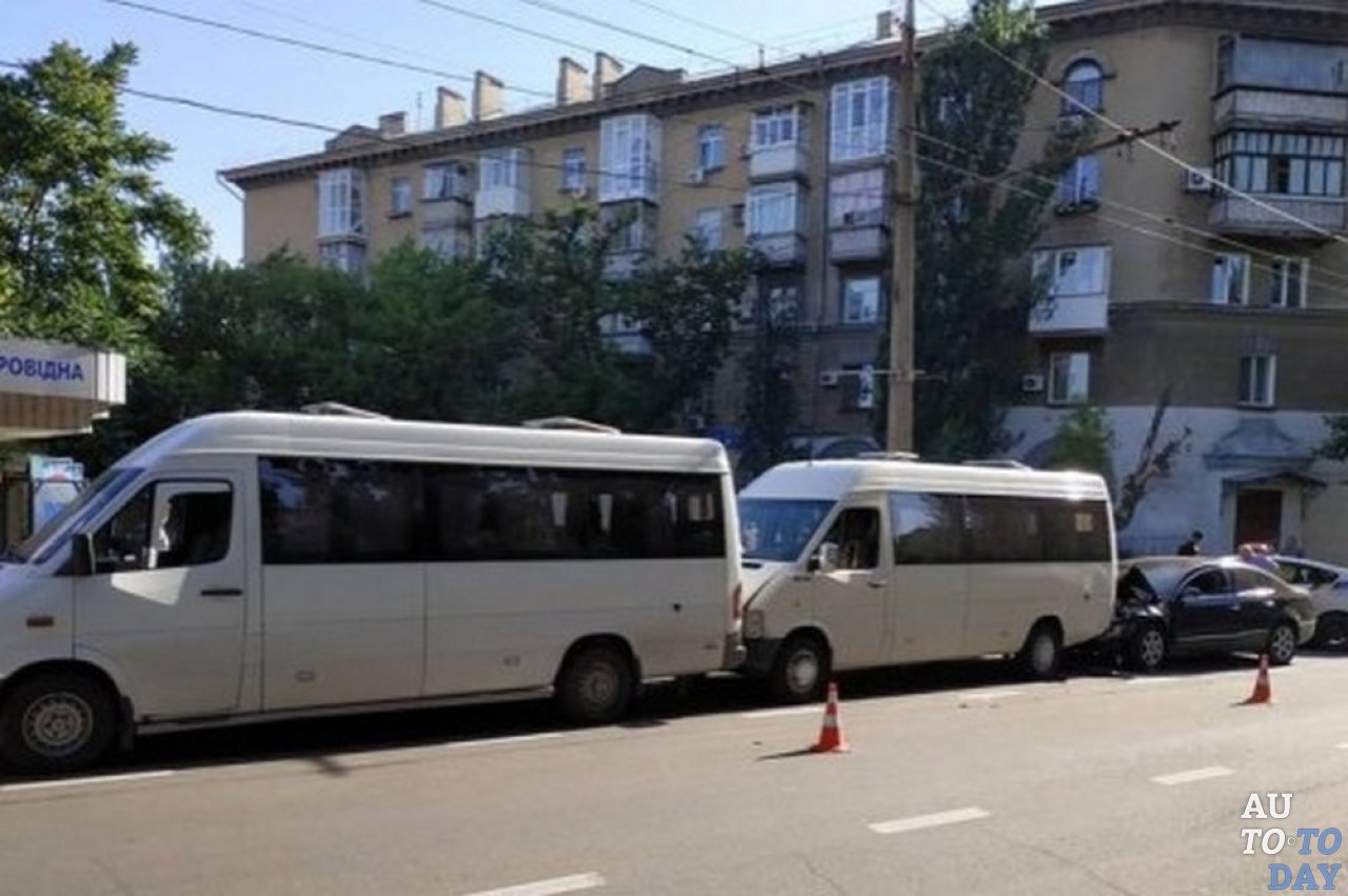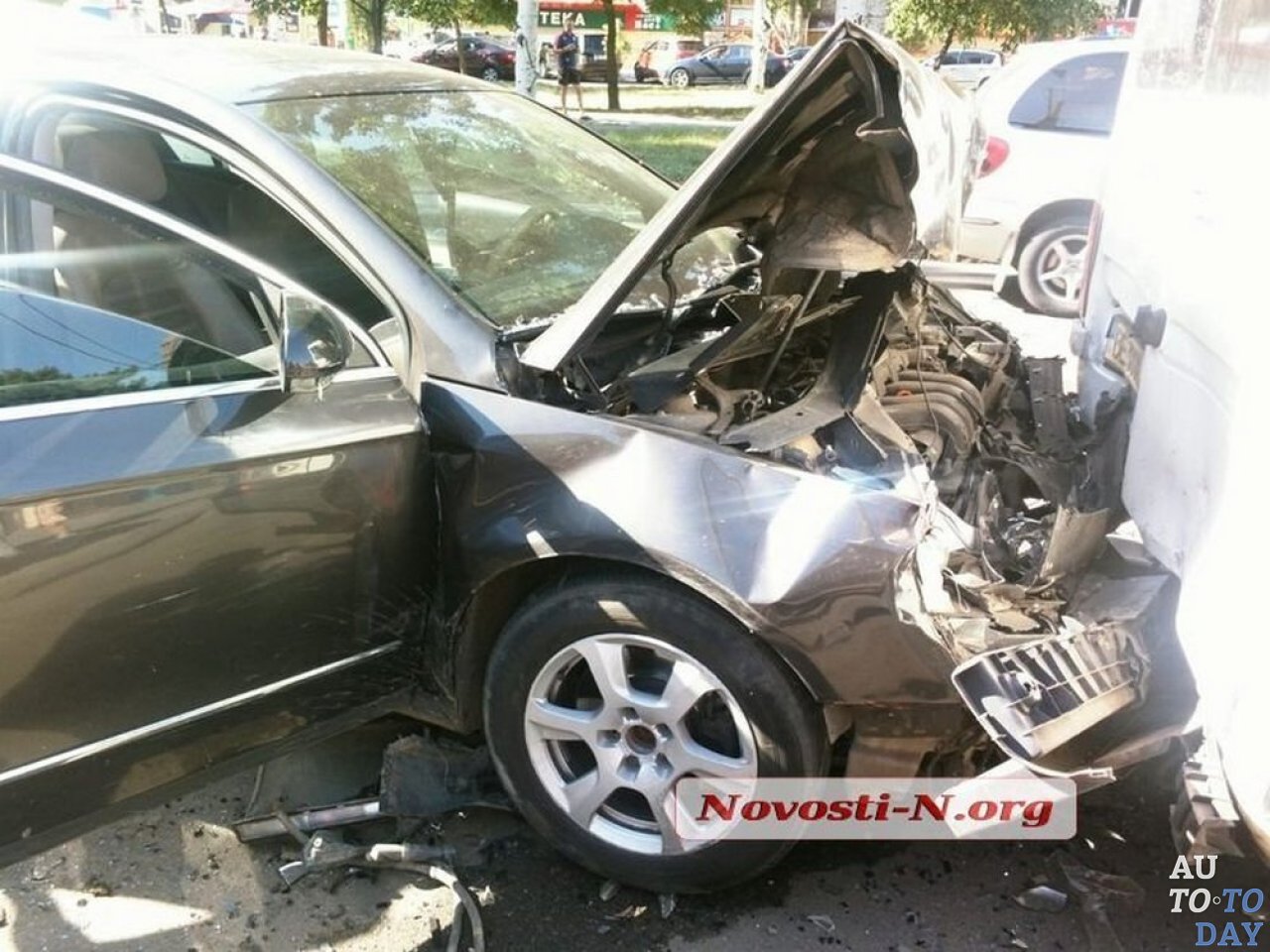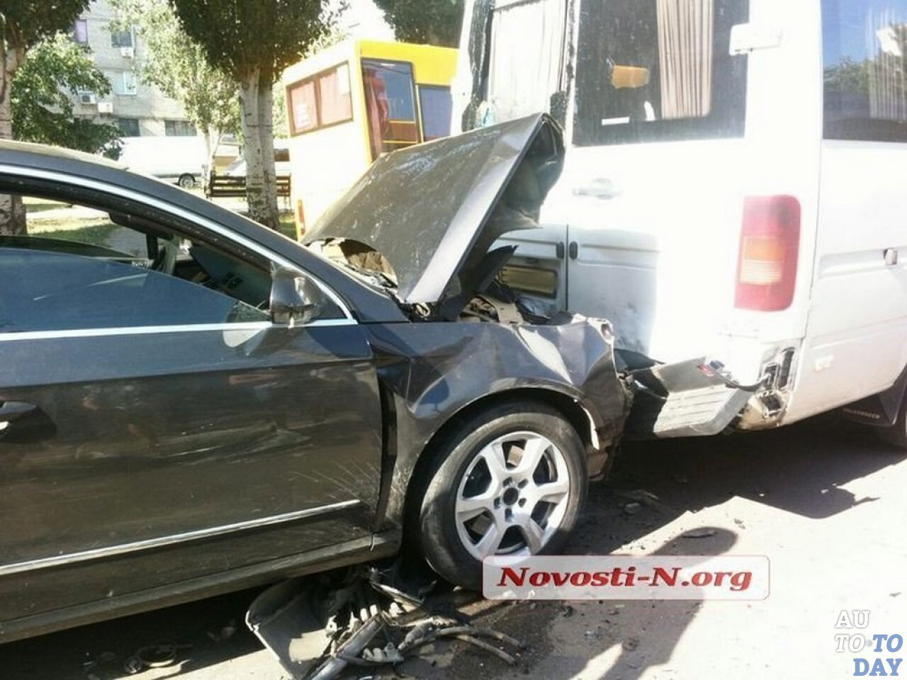 Как сообщает николаевское издание Новости N, легковой автомобиль Volkswagen Passat, двигаясь на высокой скорости, «догнал» и протаранил городскую маршрутку. Затем отлетел и врезался в стоящую на остановке другую маршрутку, которая в свою очередь ударила маршрутку, стоящую впереди.