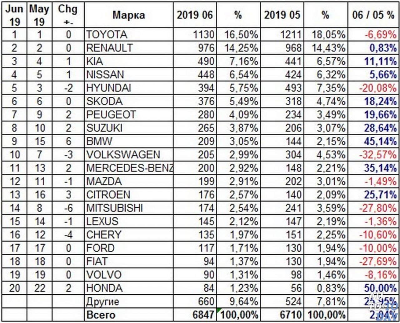 Наибольшей популярностью по-прежнему пользуется марка Toyota. Второе место заняли автомобили Renault, а вот за третье место сразу трем брендам (Kia, Hyundai и Nissan) пришлось побороться. В итоге успешнее оказалась Kia, которая и заняла третье место. Skoda привычно заняла шестое место, а вот на седьмое место с результатом 4,09% рынка впервые в истории поднялся французский бренд Peugeot, вытеснивший с этой позиции немецкого автопроизводителя Volkswagen.